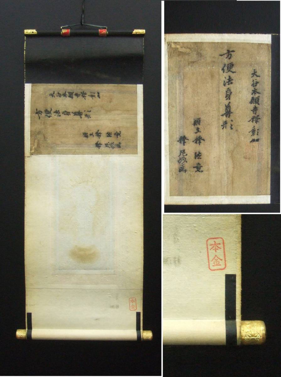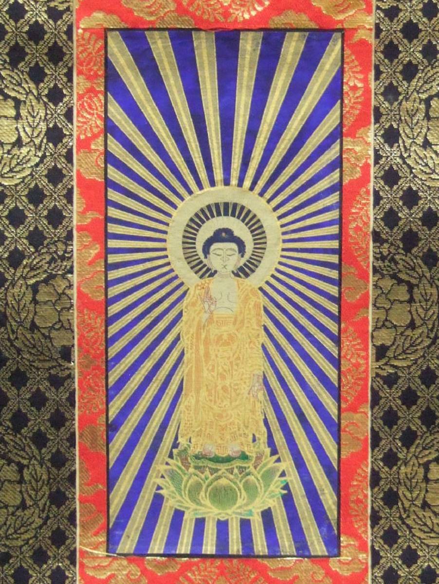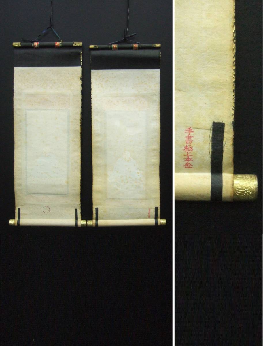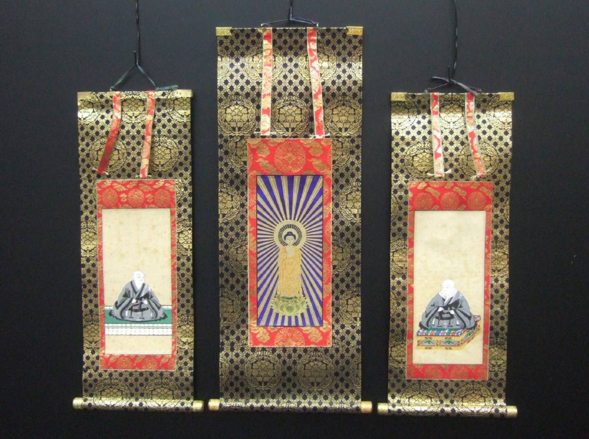 | 商品説明 | ■商品■ 100代仏壇掛軸・浄土真宗大谷派 第23代門主彰如(1908ー1925)明治41年~大正14年 ・阿弥陀如来 絹本絹装 70代仏壇掛軸 ・親鸞聖人・蓮如上人 絹本絹装 ■サイズ■ 阿弥陀如来 ・全体 縦・約48.4cm/横・約18.1cm(軸先・約21.0cm) ・本紙絵柄 縦・約19.2cm/横・約8.4cm ・本紙赤枠部 縦・約26.2cm/横・約10.6cm 親鸞聖人(右) ・全体 縦・約40.5cm/横・約15.0cm(軸先・約17.6cm) ・本紙絵柄部 縦・約19.4cm/横・約9.0cm ・本紙赤枠部 縦・約25.0cm/横・約10.5cm 蓮如上人(左) ・全体 縦・約41.0cm/横・約14.8cm(軸先・約17.2cm) ・本紙絵柄部 縦・約18.9cm/横・約9.1cm ・本紙赤枠部 縦・約24.5cm/横・約10.4cm ■説明■ 年数経過の時代ものです。ヤケ、シミ、シワ、汚れ等がございます。画像にてご確認下さい。阿弥陀如来は一度表装直しをしたものと思われます。画像では捉えきれない部分もありますが、ご理解ご了承のうえ、入札にご参加下さい。 | ||