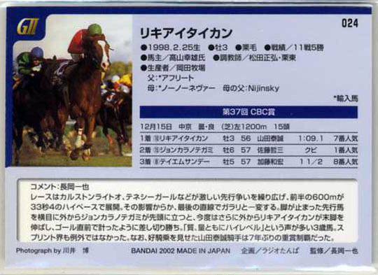 | ★サラブレッドカード2001年下半期版 パラレル 箔押し金文字サイン 024 リキアイタイカン 第37回CBC賞 山田泰誠 写真 画像 競馬カード 即決 | |
