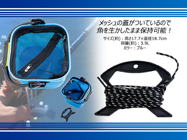 折り畳み式 コンパクト バケツ 20cm【持ち手プラ】ロープ/メッシュカバー付き 水汲み ブルー 青 釣り ガーデニング タンク 砂遊び