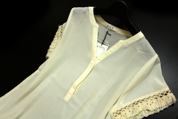 ブランド イトキン(株) ELLE エル 表記サイズ 38 実 寸 (cm) 着 丈56-62 肩 幅33 胸 周 り44 袖 丈16 *** サイズの計り方は「サイズの計り方ガイド」をご覧ください *** 素材 ~画像の製品表記タグをご覧ください~ カラー アイボリー **画面上の色はブラウザや設定により、実物とは異なる場合がございます。*** 実物に近いお色をお伝え出来る様努めておりますがご了承の上ご入札頂きます様お願い致します。 商品情報 袖先がコットンレースのフリンジになった可愛いジョーゼット素材のプルオーバーです。 ★ こちらの商品の発送方法はネコポス(300円)、レターパックライト(360円)、クロネコヤマト宅急便(680円:北海道・沖縄1000円)です。 (アクセサリー、ハンガーは出品物では御座いません。) ランク (S) (S) 新品・未使用品 (A) 数回着用程度の超美品 (B) ダメージ無く綺麗な状態の美品 (C) 多少使用感のある一般的なUSED品 (D) 傷、汚れがあり使用感を感じるUSED品 (E) 難有。訳あり品 ※ ランクはあくまで主観によるものです。参考程度とお考えください。 ※ 新品・未使用の商品も「写真撮影」 「保管状況」などにより、小さな傷、かすかな汚れ、毛玉、シワがある場合がございます。お安く出品しておりますので、ご理解の上入札をお願い致します。