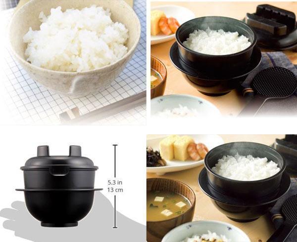 かわいらしいお釜で1合のごはんが電子レンジで手軽に炊ける。