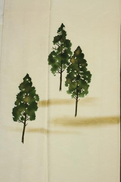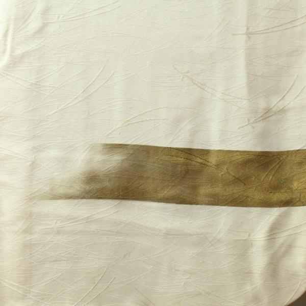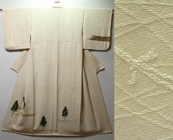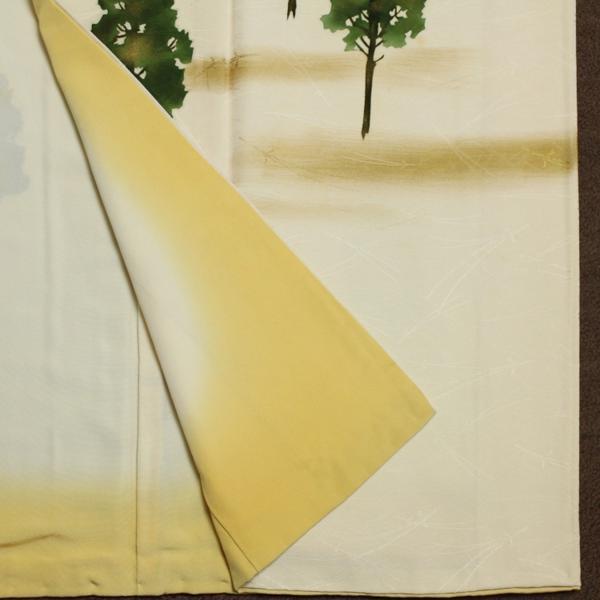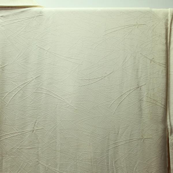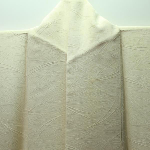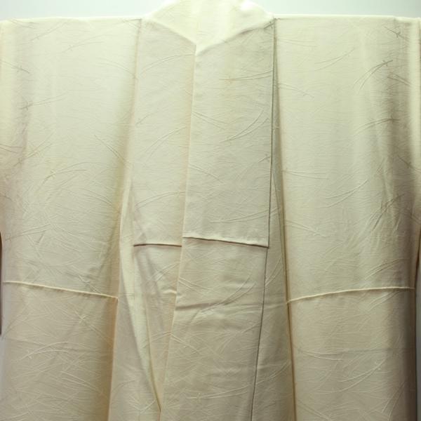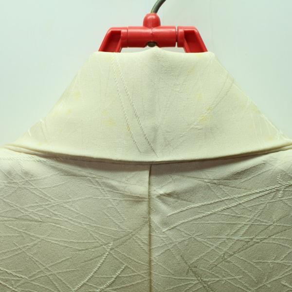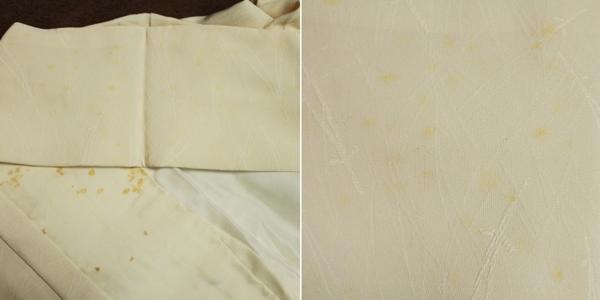 クリーム色系です。襟に薄いアクが多数あり、裏地にもアクが多数あります。八掛けに薄いアクがあります。前左身頃・おくみの柄あたりに薄いアクがあります。