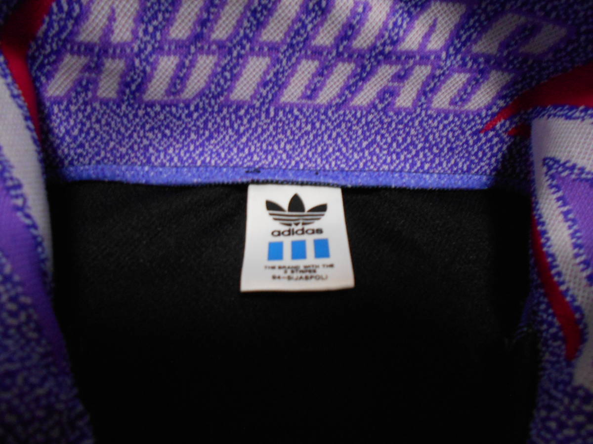 EARLY1990S ビンテージ アディダス デサント特有の肌触り良く丈夫なジャージー素材感、三つ葉トレホイル刺繍エンブレム + 襟裏ADIDASロゴ、ショート丈 × 逆三角シルエット、アームの切返しのバイオレットトライアングルデザイン、ADIDAS刻印ゴールドジッパーヘッド   等等... 近年のプロダクツには絶対にない、EARLY1990Sビンテージ オリジナルの風合いの良さ