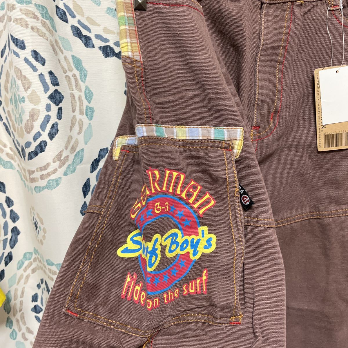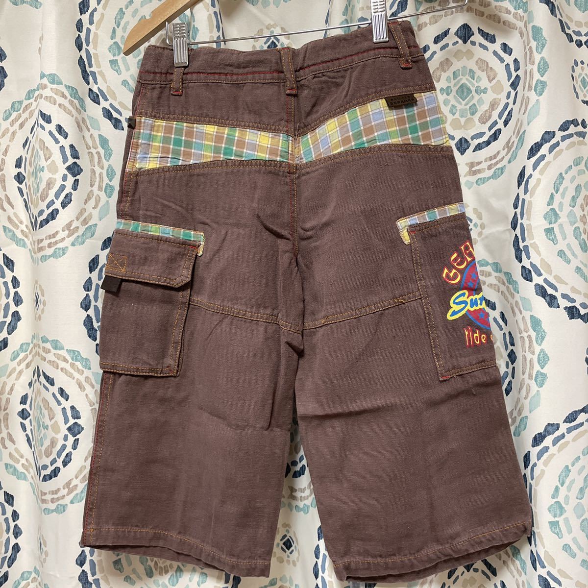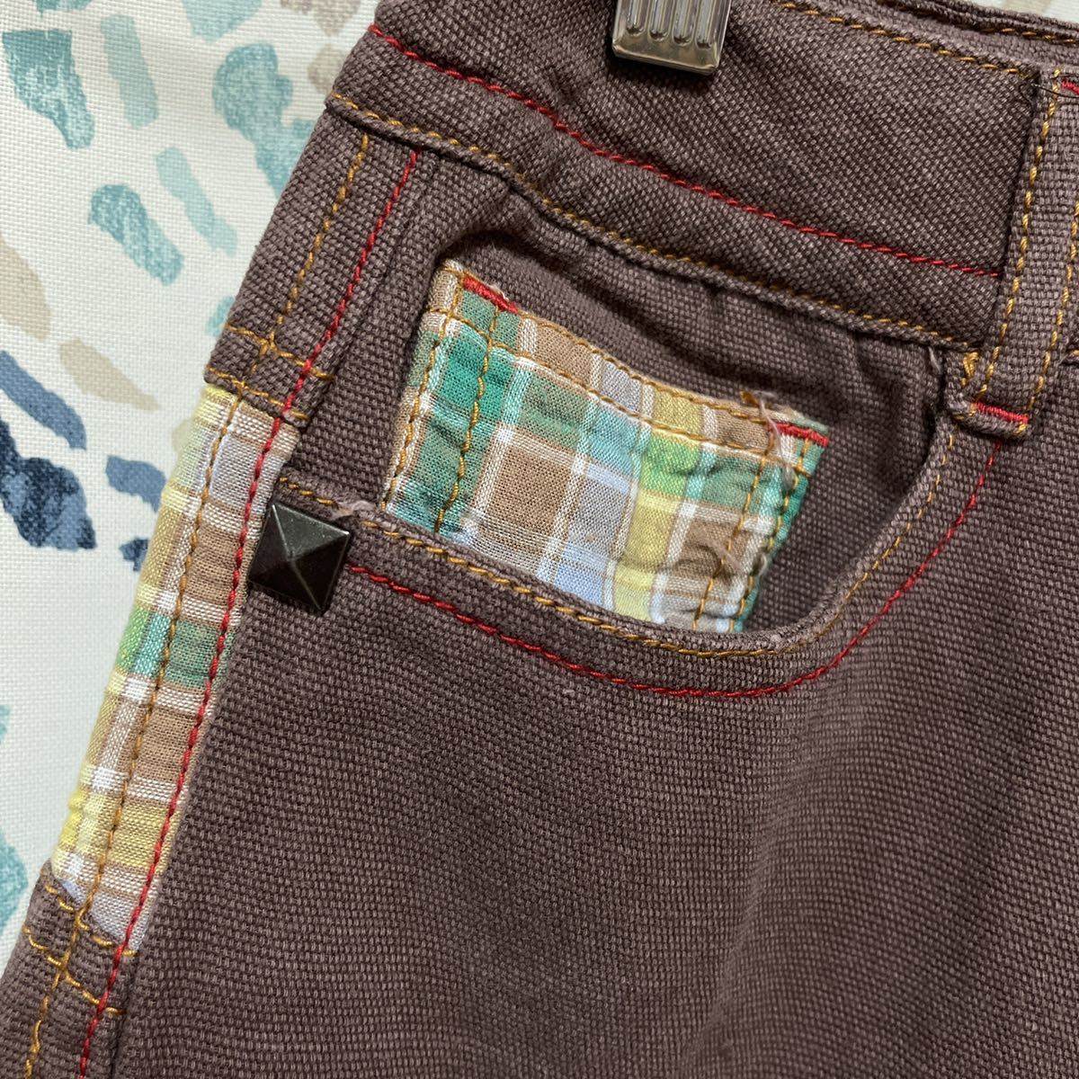 ◆赤とオレンジのステッチ系♪ポケットにプリント♪チェック柄のパッチワークもオシャレなハーフパンツ♪少し柔らかめのデニム素材風です