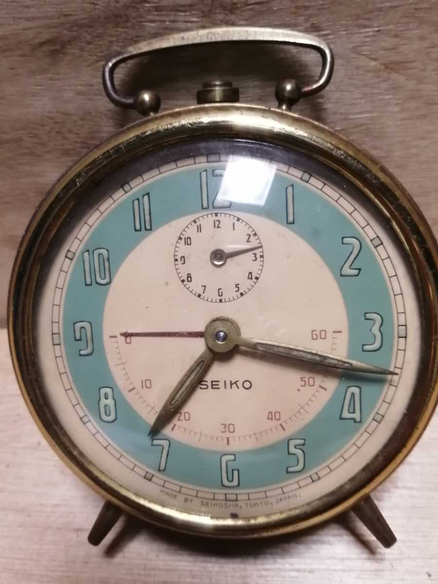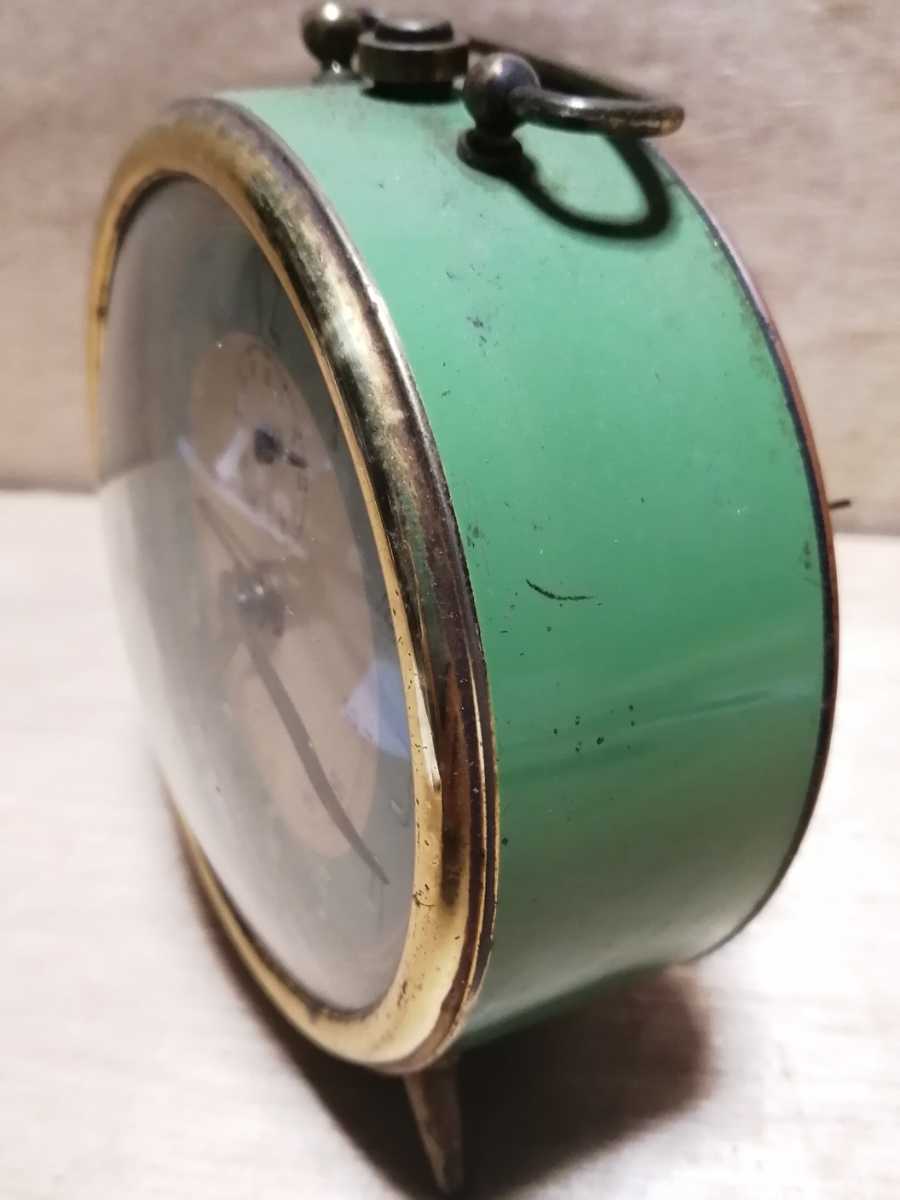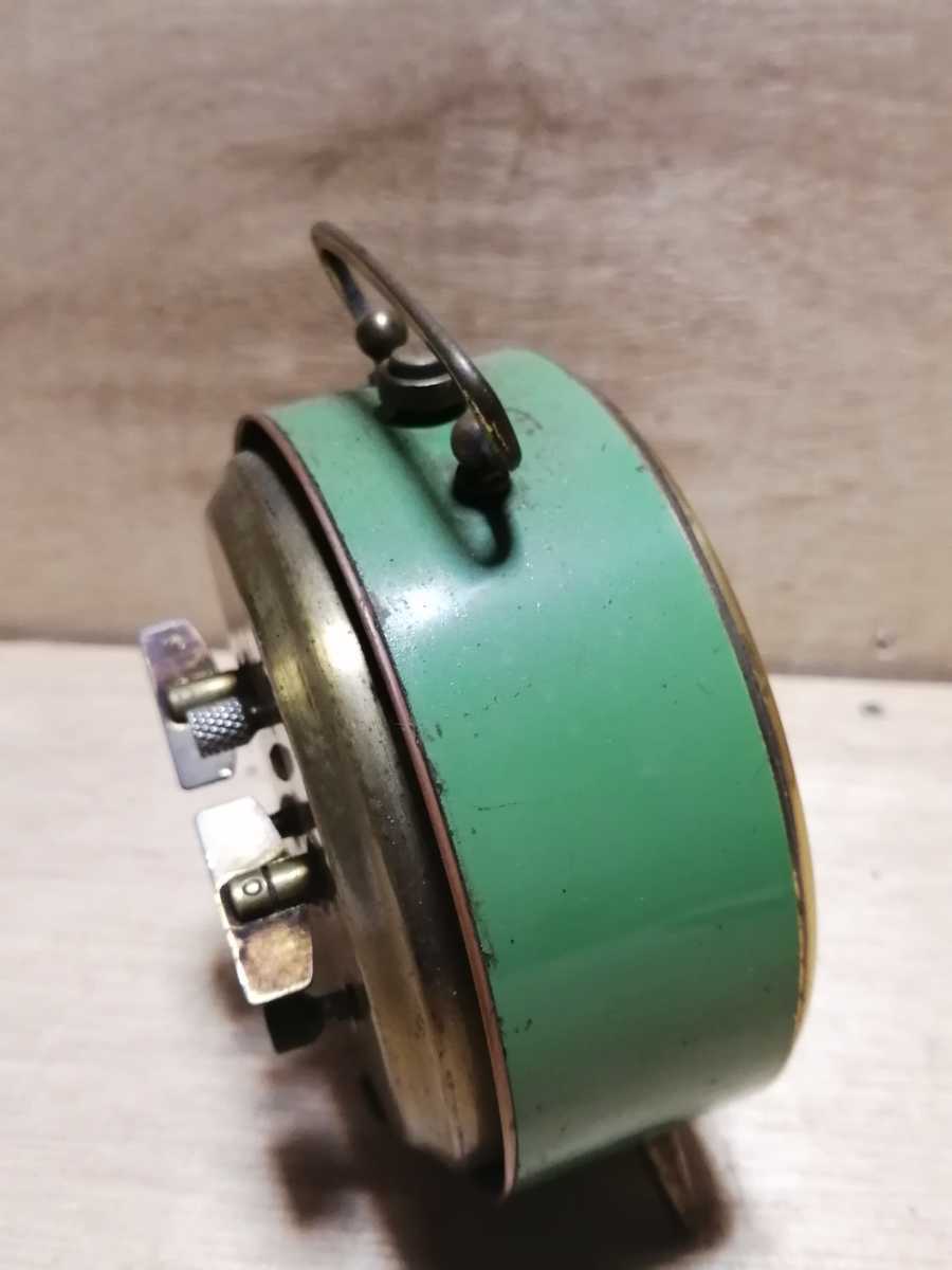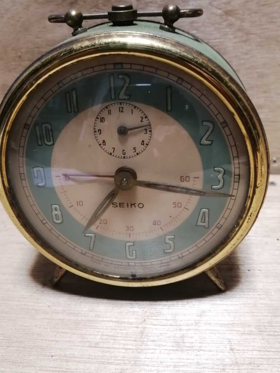 昭和30年代のセイコーの目覚まし時計です。グリーンとゴールドでまとめられた垢抜けたデザインです。表示も見やすく洋室にぴったりです。ゼンマイを巻くと動きます。(2021.11,6現在)その他の機能精度は未確認です。また現状は保管中あるいは輸送中に変化する可能性がある事をご承知おき下さい。径11㌢幅7㌢高さ14㌢重さ478㌘