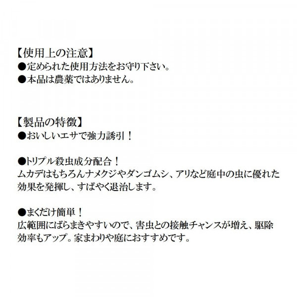 仕様 | 適用害虫:ムカデ、ヤスデ、ナメクジ、ダンゴムシ、ワラジムシ、アリ、コオロギ、カタツムリ、ゲジ |