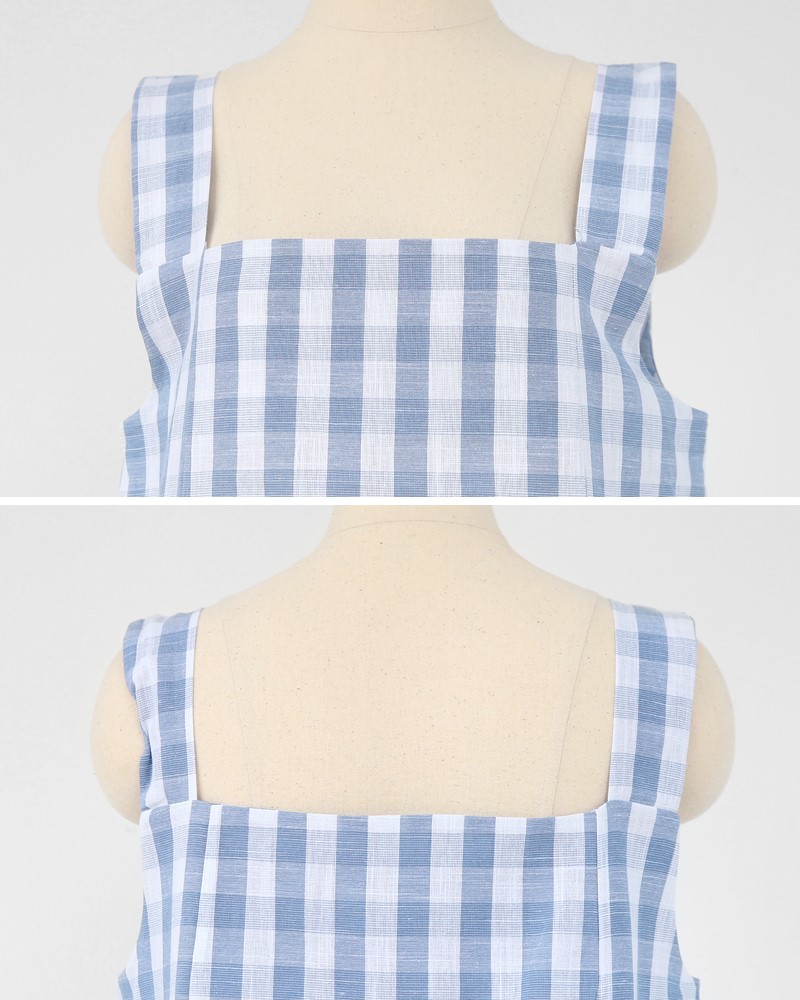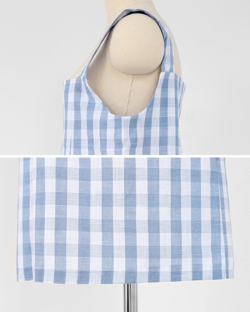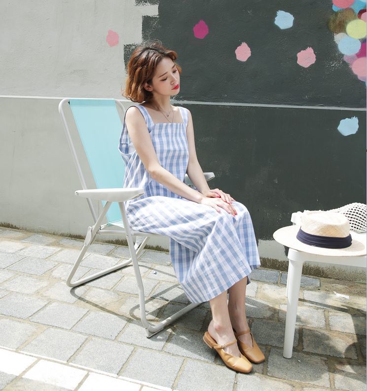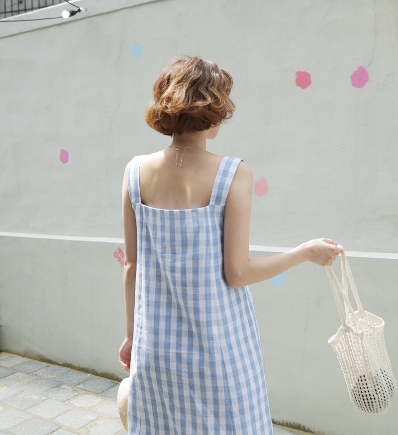 春夏 爽やか水色チェックワンピース M~L 可愛い ノースリーブ
