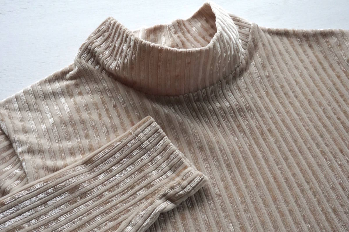 立体的なストライプが可愛い、ベロアハイネックカットソー。