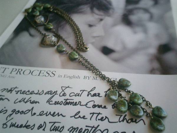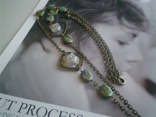 ナイーブ少女・・シリーズです♪お澄まし猫さん・・キュートな猫さんとチェコビーズのネックレスです♪11ミリ×9ミリのツイストオーバルのチェコビーズはシックなマーブルグリーンです♪デザインリングやチェコの猫さんを合わせてラリエット風のデザインです♪長さは72センチ+アジャスター13センチで最長85センチ位です♪♪トップは7・5センチ位です♪お揃いのブレスレットやイヤリングも出品しています♪ハンドメイドをご理解いただいてノークレーム・ノーリターンでお願いします♪