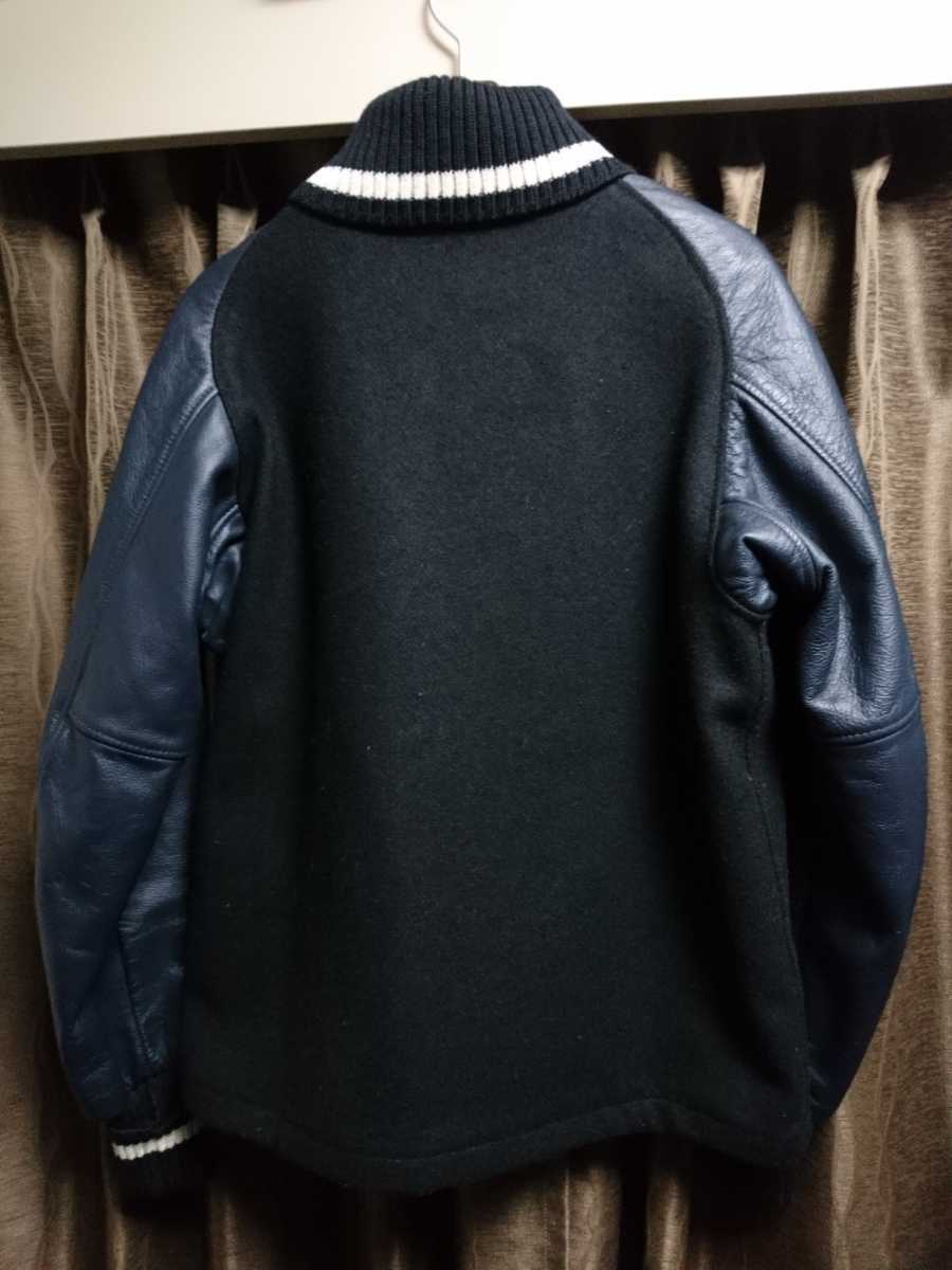ボディはブラックのメルトンウール、袖はネイビーのレザー、裏地は生なりのコットンツイルです