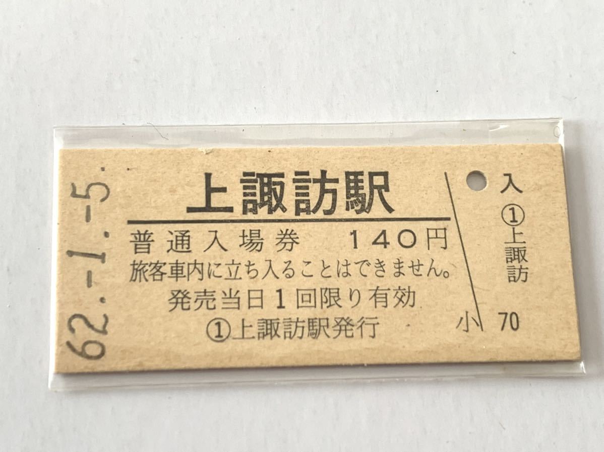 こちらは古い切符 上諏訪駅 普通入場券 昭和62年1月5日 硬券です。
