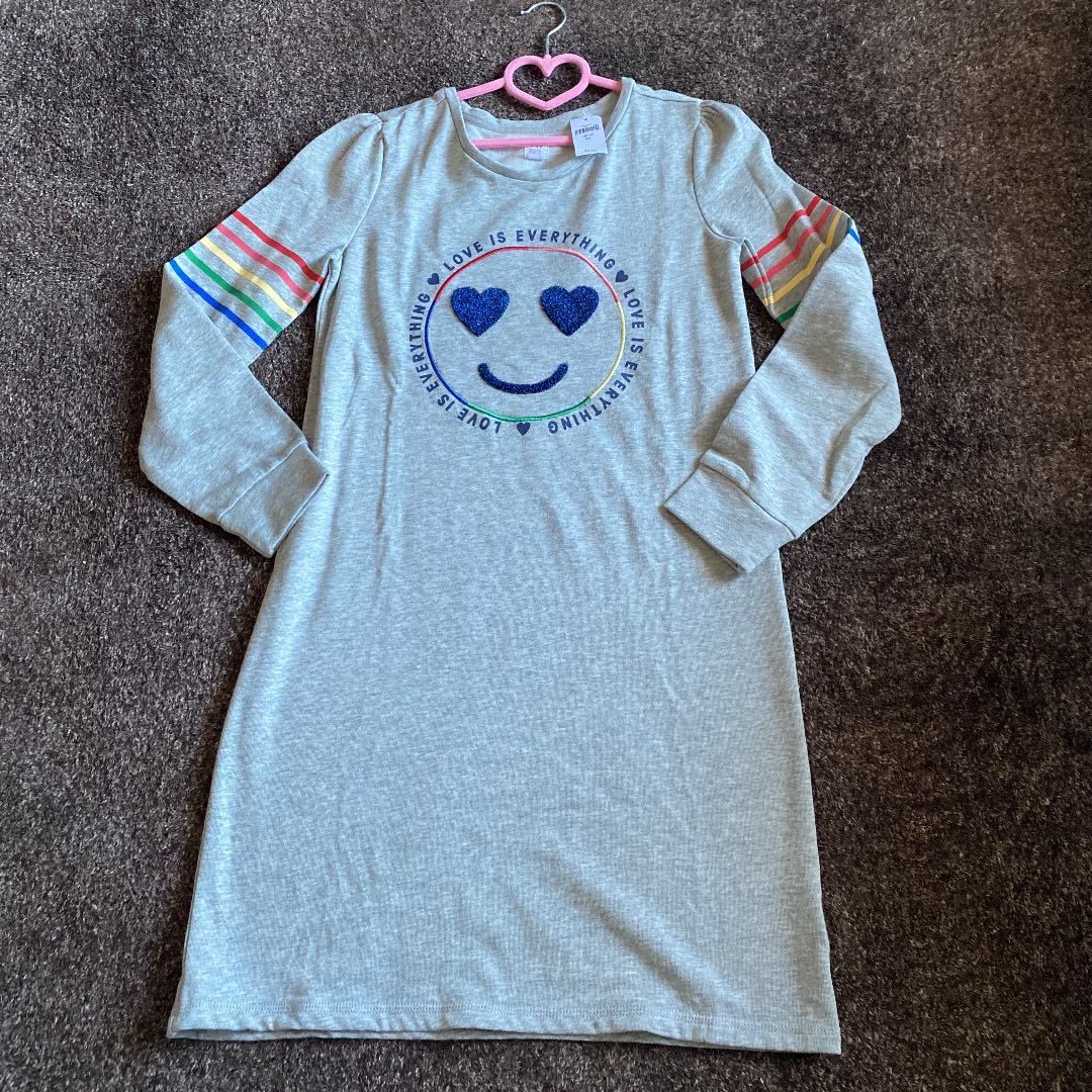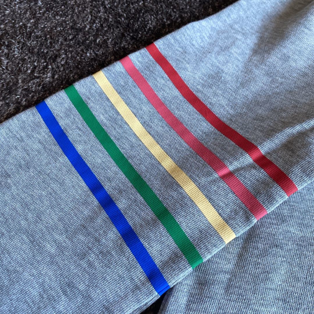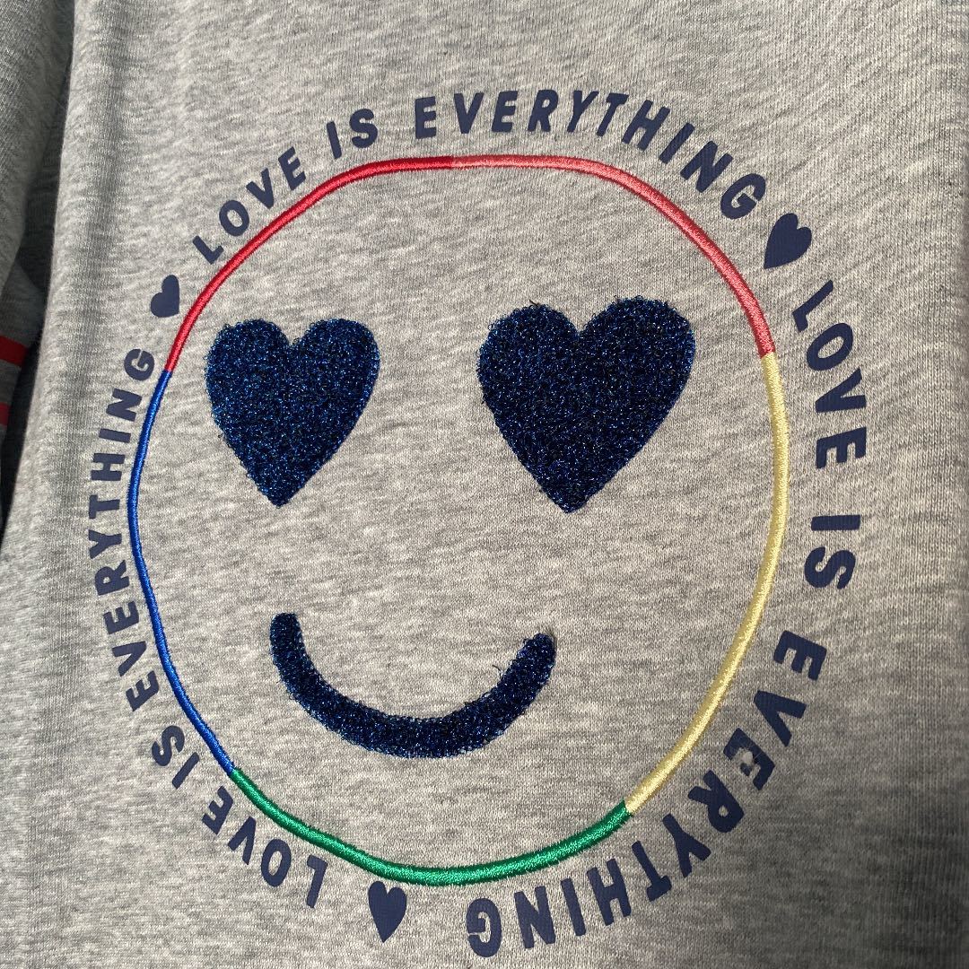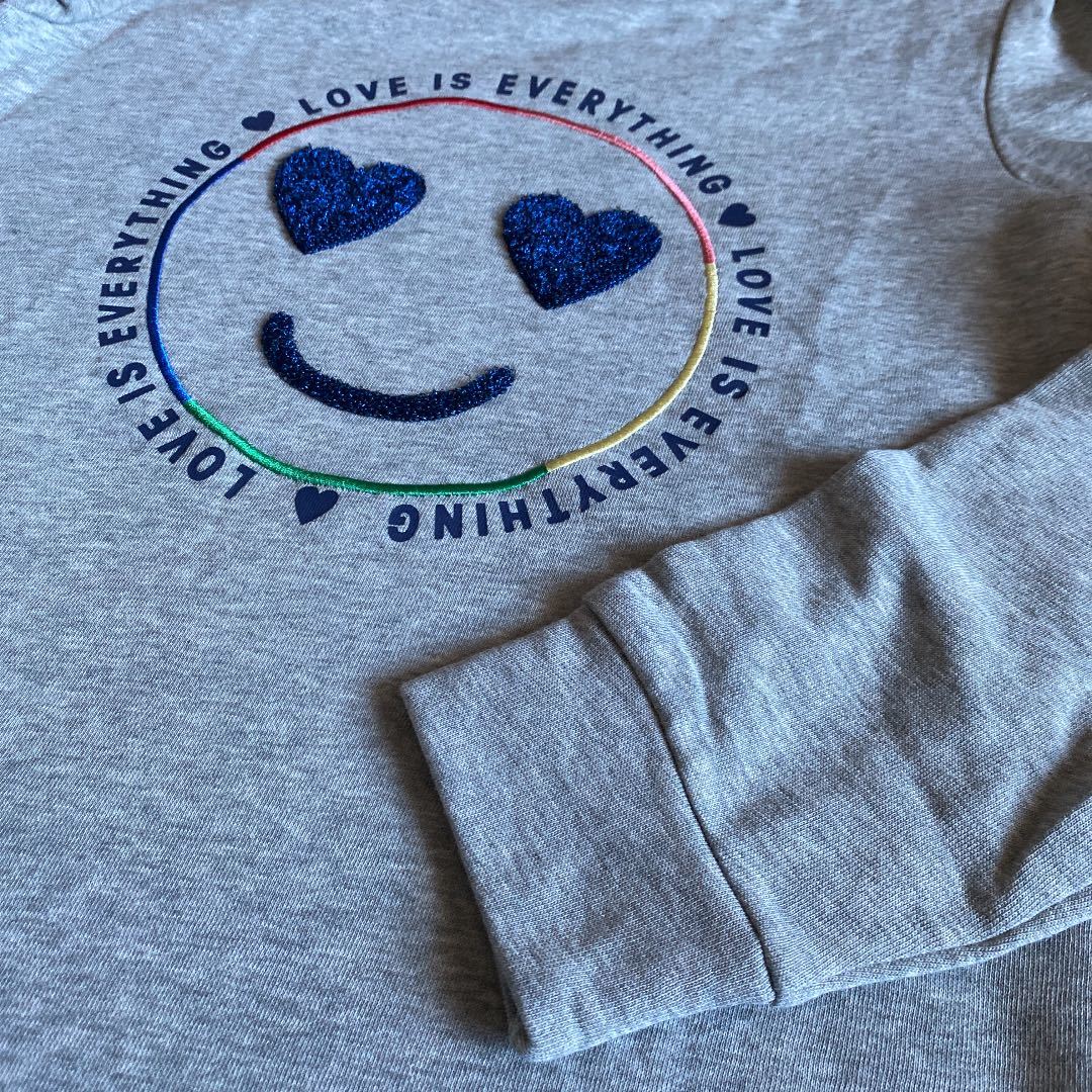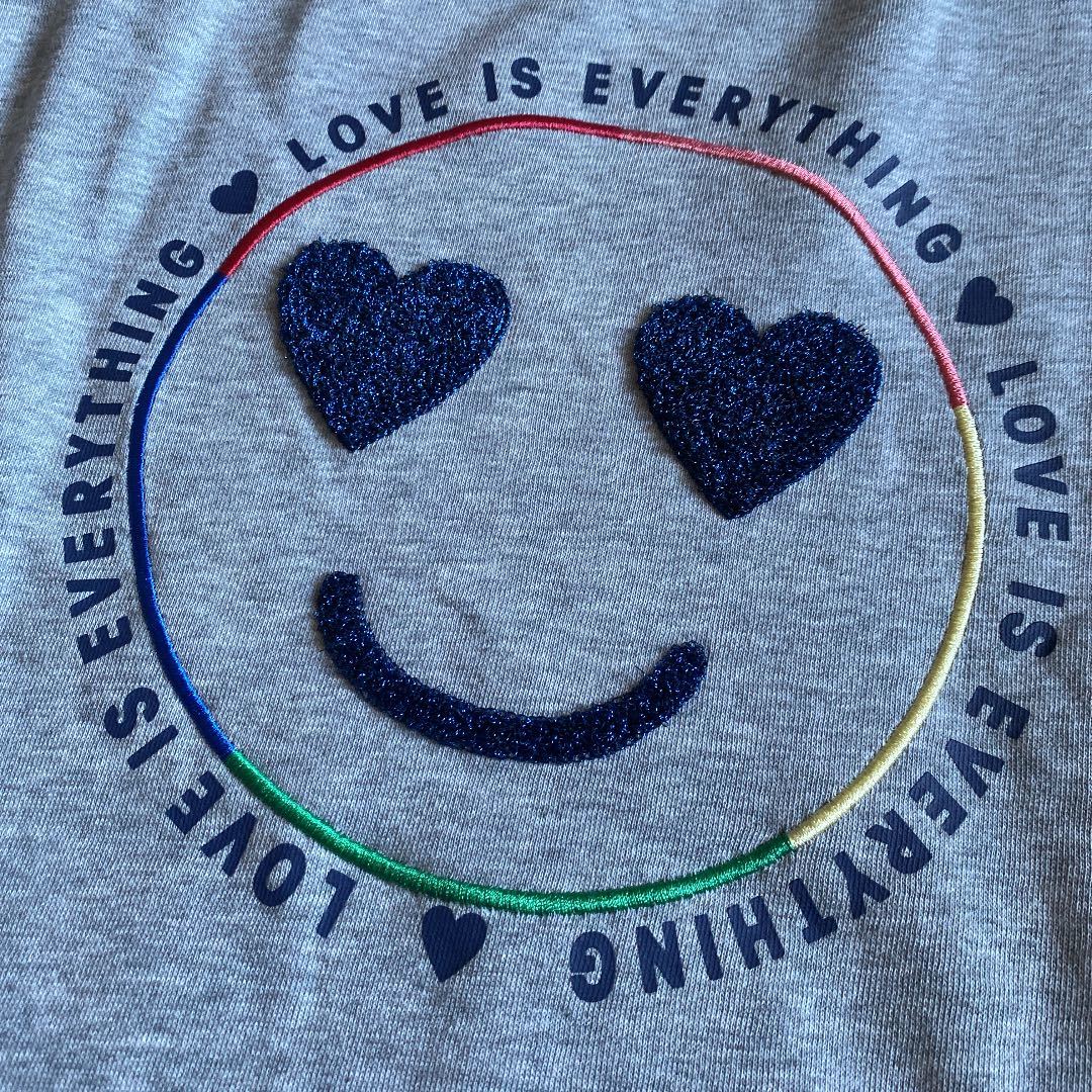 ハートの目が可愛いニコちゃんはモールのようなサガラ刺繍のような素材で、レインボーの刺繍も可愛く こだわりが感じられる1枚です