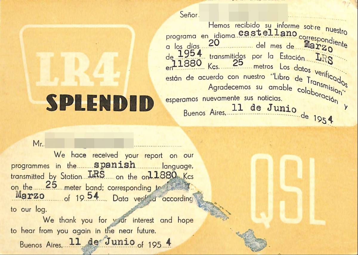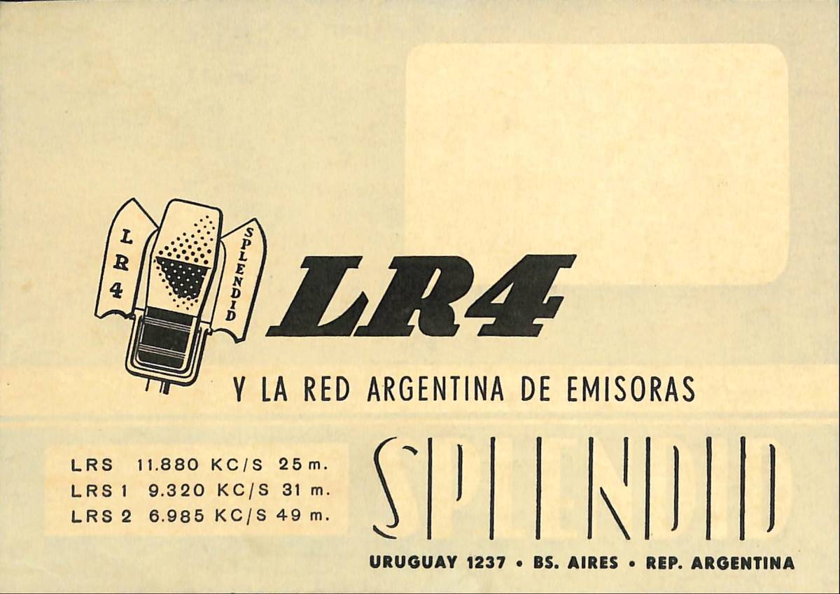 | 【商品名】・・・RADIO SPLENDID (★LR4・ラジオ・スプレンディッド )のベリカード。 【コメント】・・・スペイン語が主で小出力の為、日本での受信は困難です! ■当方、1枚のみ所有していますので即決で落札者様のコレクションになります! 【国名・地名】・・・アルゼンチン共和国★首都 ブエノスアイレス。 【受信データ】・・・1954年3月20日・SW11880KHZを受信。 【記載事項】・・・受信データ・受信者の氏名が記載。 【状態】・・・シワ、汚れ、シミ、焼け、ハガレ、糊跡、色あせ等があります。 ■カードの状態は★画像を参考に判断して下さい。 ■この機会にぜひこのベリカードを貴方のBCLコレクションに加えて下さい! | |
