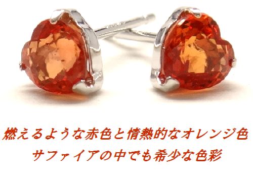 K10WG レッドオレンジサファイア 4mm ハート ピアス ジュエリー ホワイトゴールド 9月誕生石 サファイア 天然石 高品質 かわいい 箱付き