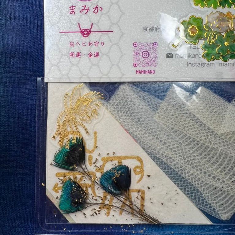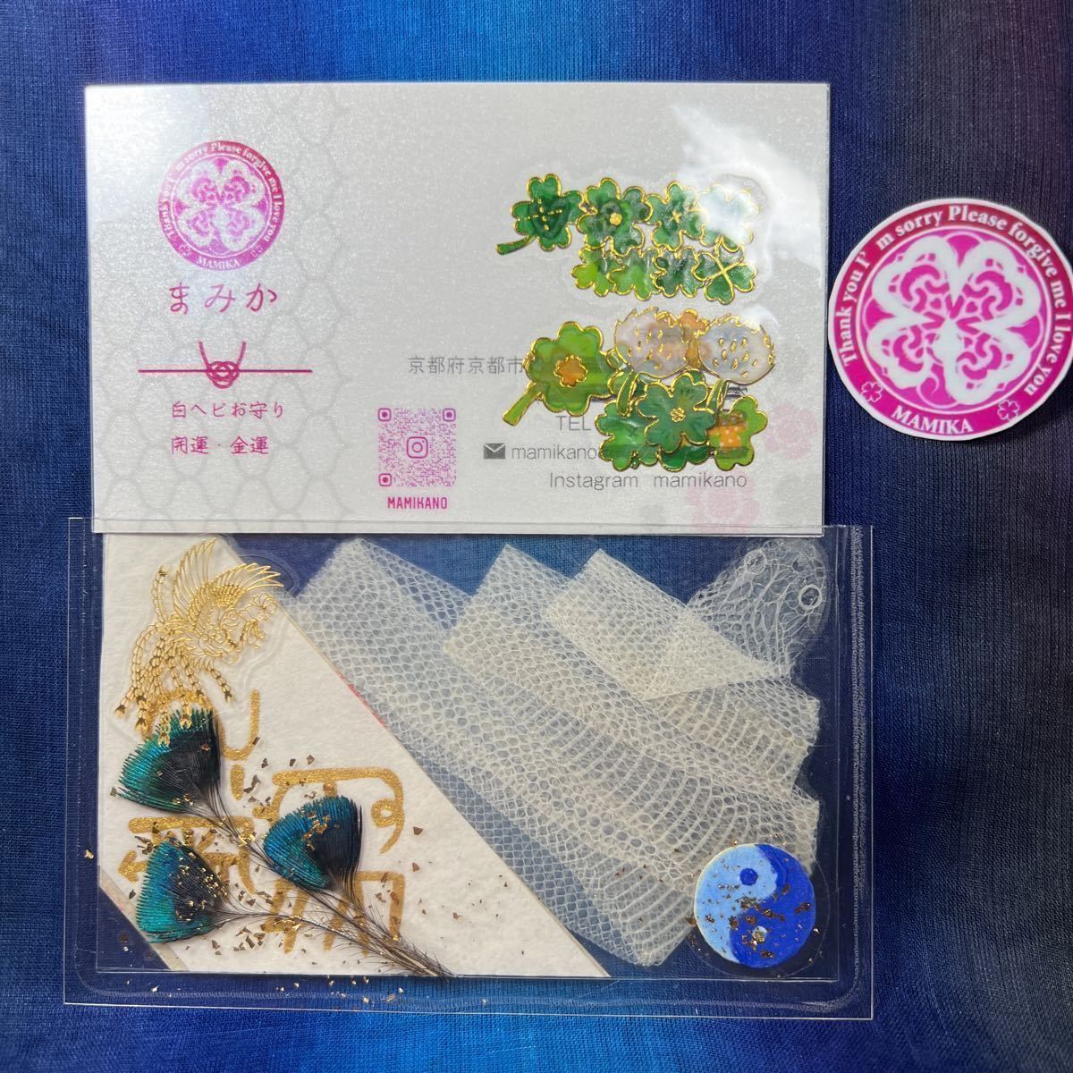赤目の白蛇様の衣を切らずに一匹と、麻の紙に金で龍体文字を書き、純金の鳳凰、 カイヤナイト、ラピスラズリと水晶、孔雀の王冠の羽を使い純金を散らしましたお守りになります。