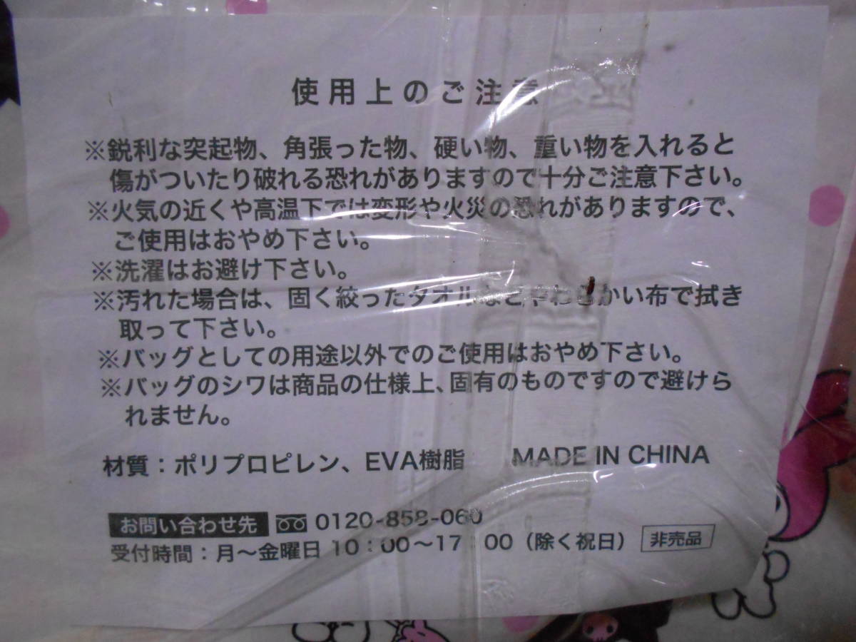 ポリプロピレン製、画像の状態で縦24.5cm、横46cm、マチ15cmほどのお品です。とても可愛い絵柄のお品です。