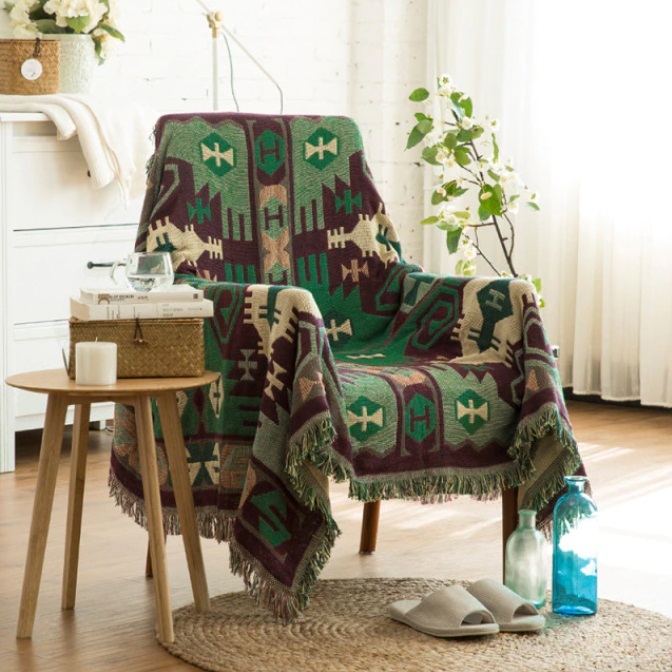 ボヘミアンスタイル ネイティブ柄 ソファー ブランケット フリンジ タッセル付き ベッドカバー 90cm×90cm 【5~8】