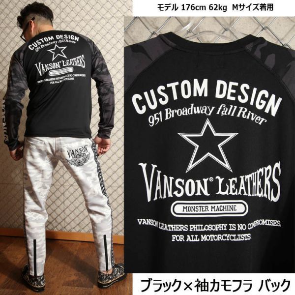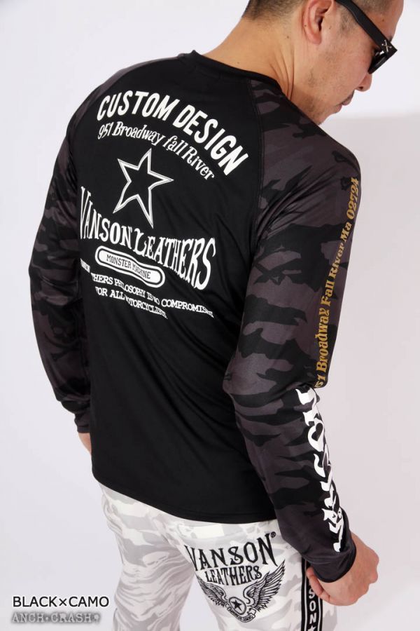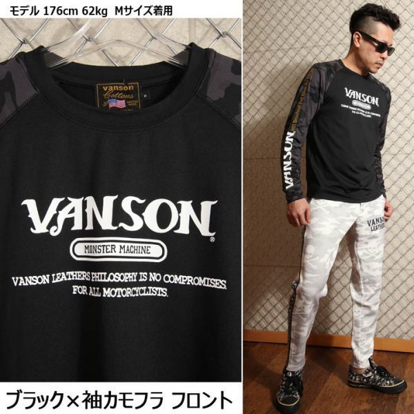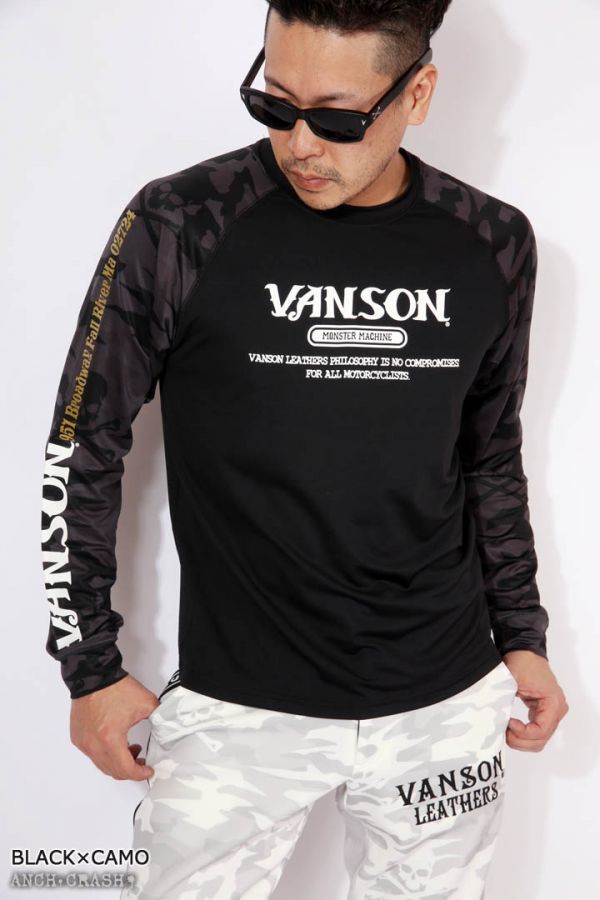 VANSON ドライ長袖Tシャツ ACVL-903 ブラック×袖カモフラ【Mサイズ】バンソン 当店別注 吸汗速乾 抗菌防臭 UVカット スポーツウェア
