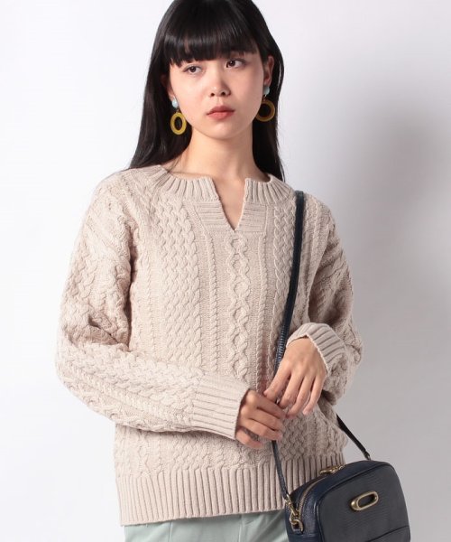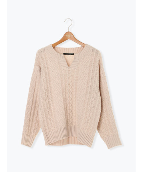 冬らしいケーブル編みをあしらったニットプルオーバーは、キーネックデザインにすることで旬度アップ。いつものコーディネートに合わせるだけでトレンドライクにキマります。ボトムスを問わないのもうれしいところ。