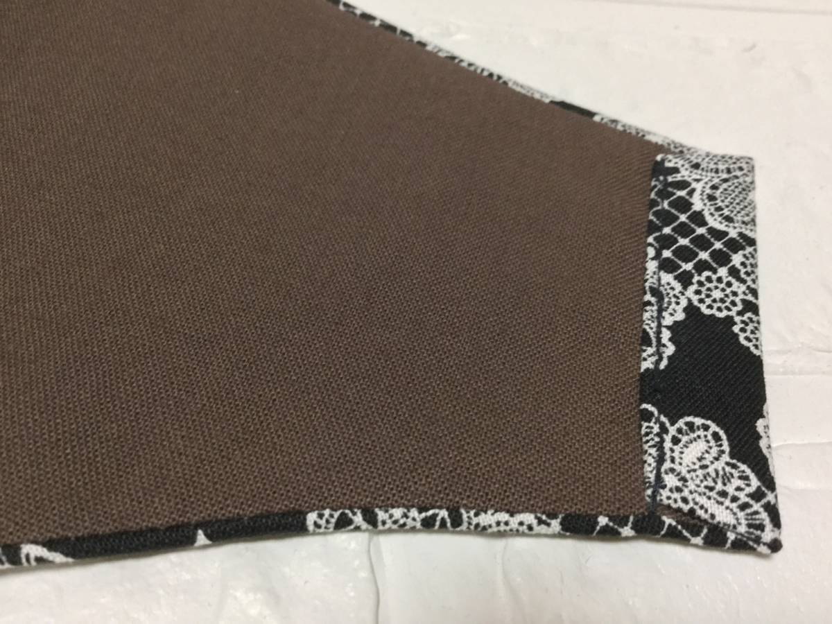 ※独自の型紙でスタイリッシュラインに仕上げました。ふんわり感を出す為に縁取りのステッチを施してありません。横幅を広目にとり、耳に近い縦の幅を狭めて小顔効果も期待♪ 女性に人気のレース柄がゴージャスですね♪ 裏地はブラウンでよりファンデ汚れを目立ちにくくしました♪ 両サイドにはゴム紐も通せます。画像最後の方の紐(ブラック:80円)も出品しております。尚、素人が制作した為、完ぺきなお品を期待される方はご入札をご遠慮くださいませ