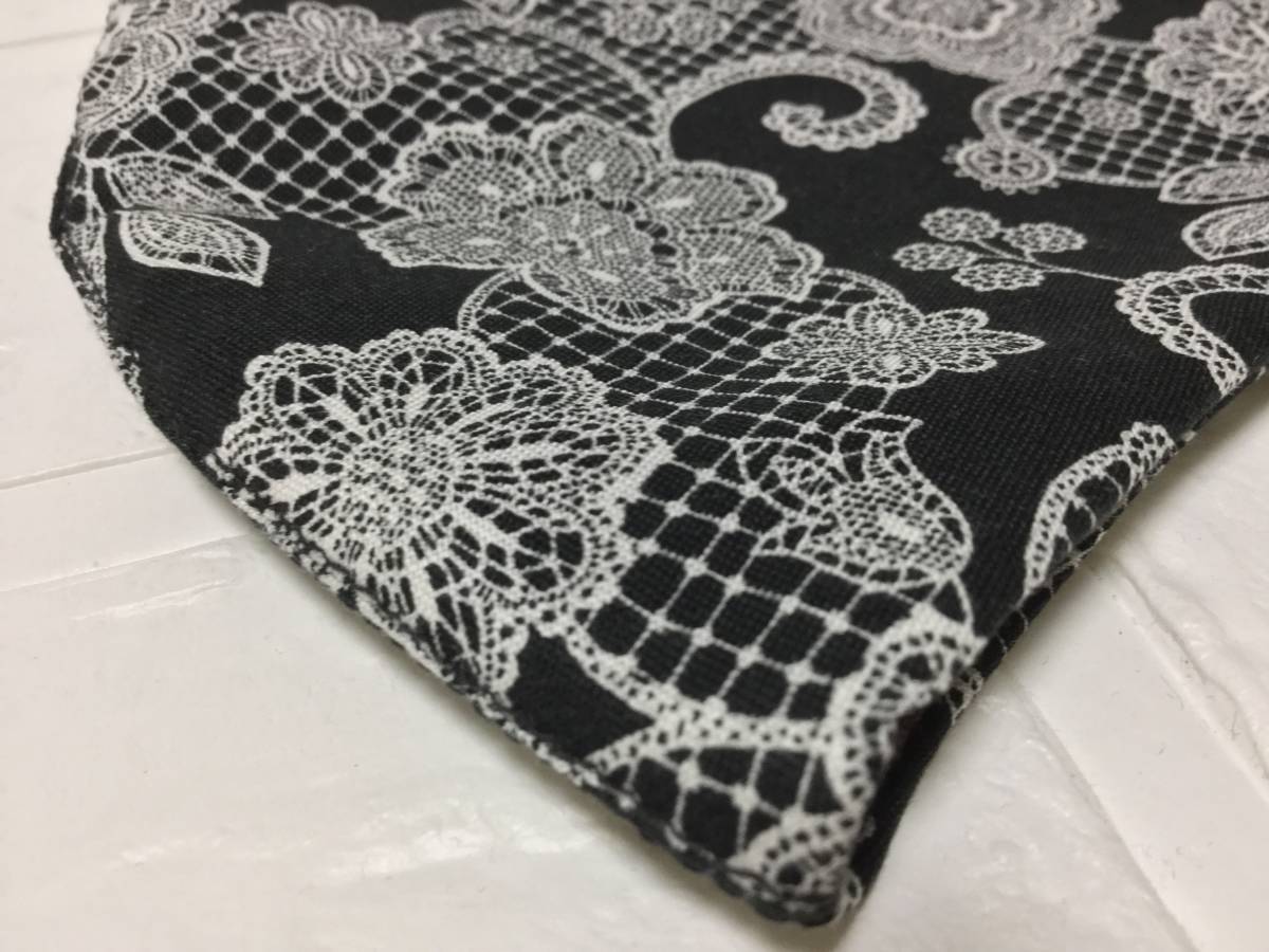 ◆お色・素材・size◆ レース柄・黒。表側:綿:100%。裏側:ブラウン。シーチング綿100%。(サラッとして肌当たりが良い素材です)。横最大(2つ折りで):約13cm。縦最大:約14cm。