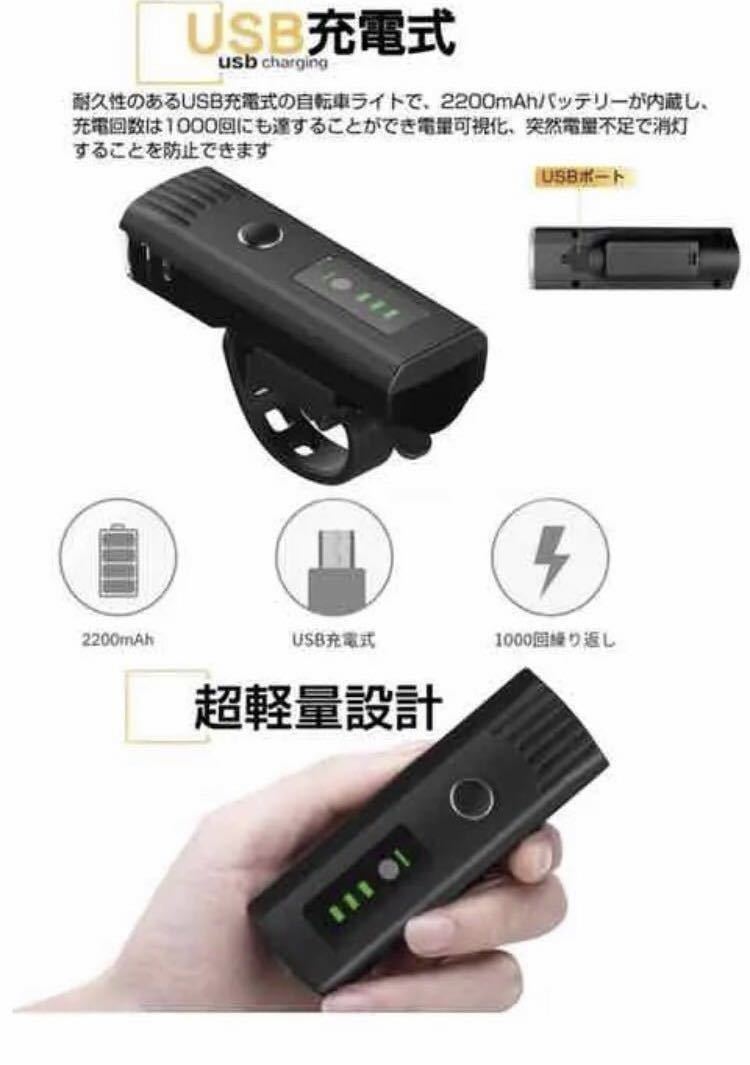 【USB充電式と2200mAh容量バッテリー】自転車用ライトはUSB充電式で、スイッチの上に3つのバッテリインジケータライトが搭載されています。