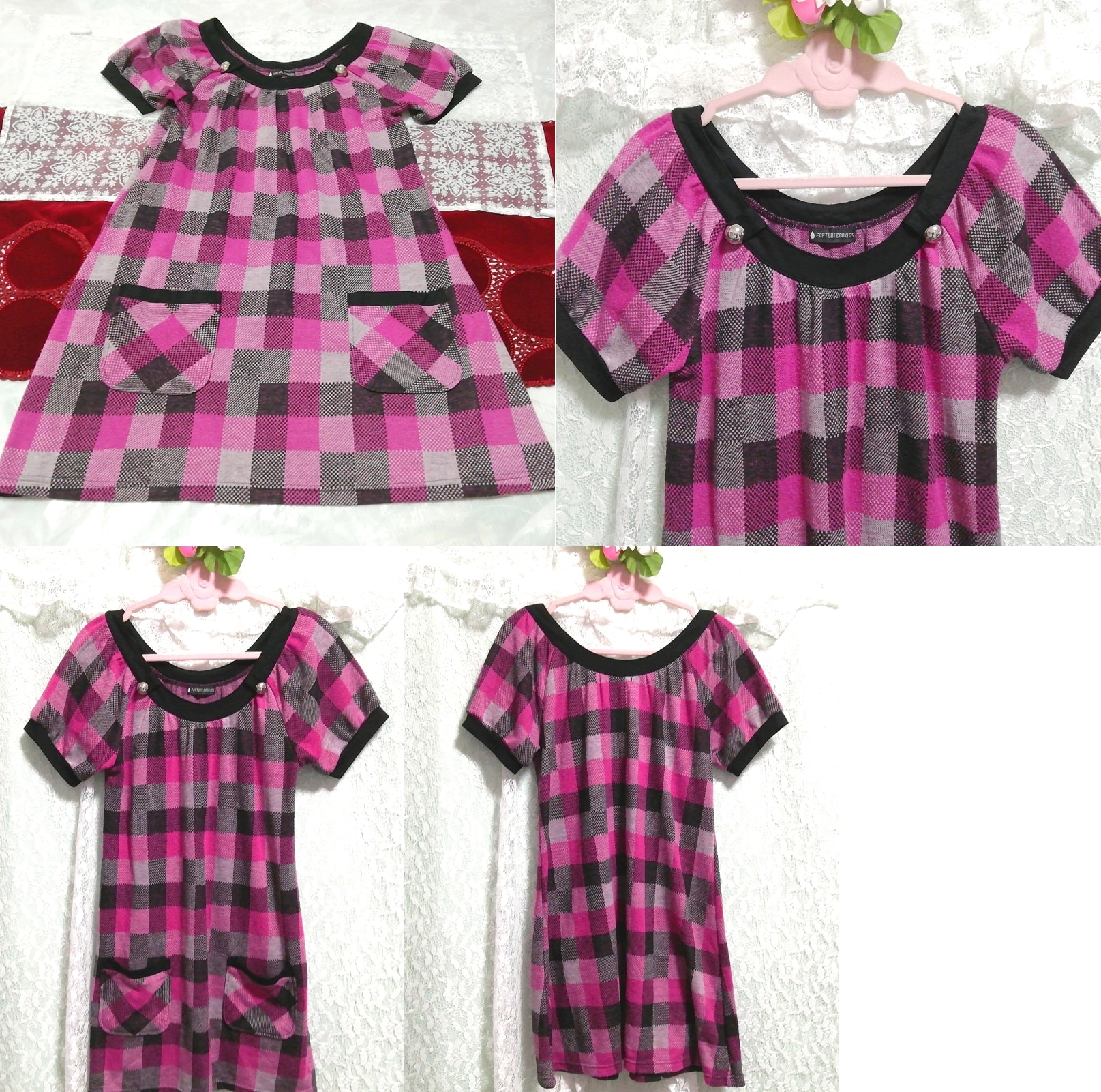 紫黒チェック柄丸ボタンチュニックネグリジェワンピース Purple black check pattern round button tunic negligee dress