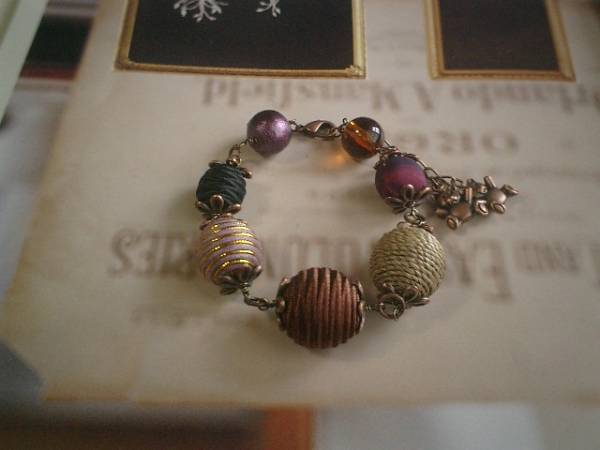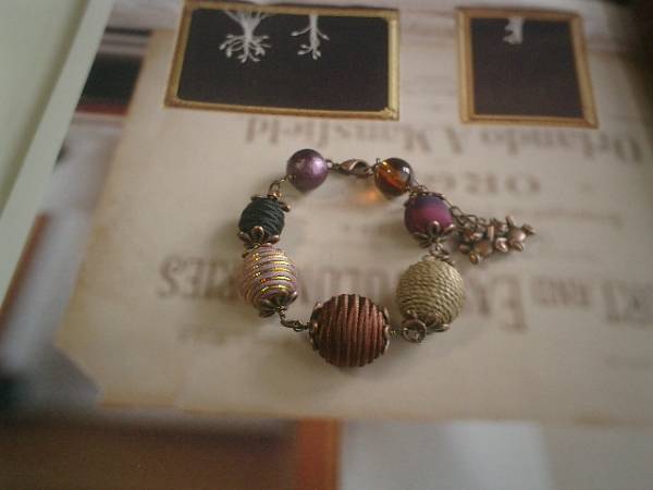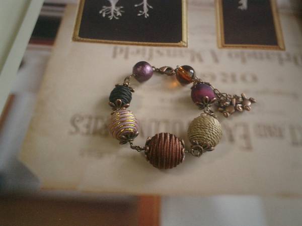 ネオ・ロマンチック・・シリーズです♪大人色の異素材を集めて・・キュートなブレスレットです♪お花の座金でおめかしした12ミリから15ミリ位までのサテンビーズや麻ボールやデザイン樹脂ビーズやウッドボールやラタンビーズやコットンパールを集めてデザインチェーンを合わせました♪シックな色と柄でまとめてアンティークモダンな表情です♪長さは全長23センチ位で調節自由です♪お揃いのネックレスも出品しています♪シンプルで飽きのこないいつまでも着けられるデザインを考えて作りました♪ハンドメイドをご理解頂いてノークレーム、ノーリターンでお願いします