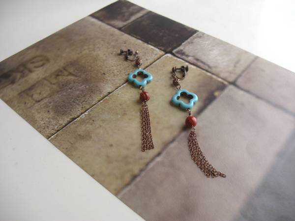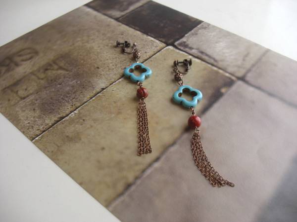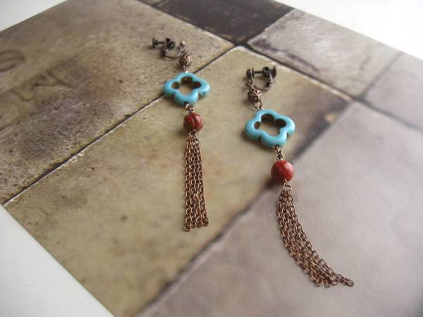 ルーズ・シルエット・・シリーズです♪チャイニーズ気分・・シックな赤のスポンジ珊瑚のイヤリングです♪爽やかなハウライト・ ターコイズやデザインチェーンを合わせてオリエンタルな表情です♪スポンジ珊瑚は8ミリ、ハウライト・ターコイズは18ミリ位のフラワーリングです♪長さは全長11センチ位です♪ピアスにも変更出来ます♪お揃いのネックレスやブレスレットも出品しています♪♪シンプルで飽き のこないいつまでも着けられるデザインを考えて作りました!ハンドメイドをご理解頂いてノークレーム、ノーリターンでお願いします
