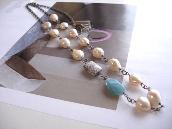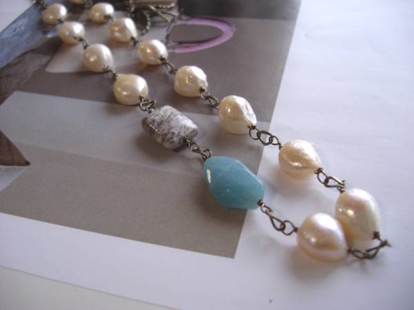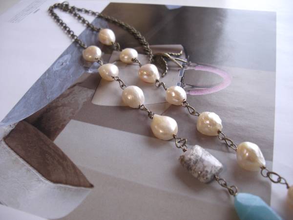 ルーズ・シルエット・・シリーズです♪深夜映画のヒロイン・・存在感のあるバロックパールのネックレスです♪一粒一粒に表情のある素敵なパールです♪ラフカットのアマゾナイトとスクエアのジャスパーを合わせてニューヨーク・モダンしています♪バロックパールは12ミリ位、アマゾナイトは21ミリ位、ジャスパーは15ミリ位です♪長さは全長77センチ位で調節自由です♪お揃いのブレスレットも出品しています ♪シンプルで飽きのこないいつまでも着けられるデザインを考えて作りました!ハンドメイドをご理解頂いてノークレーム、ノーリターンでお願いします