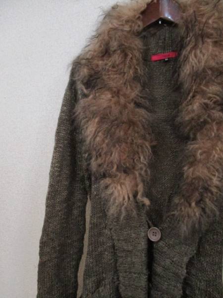| 商品紹介 | 取り外しできる襟周りのファーがオシャレなロングニットカーディガンです。 色はカーキです。 《素材》 本体:アクリル100% ファー:チベットラム |