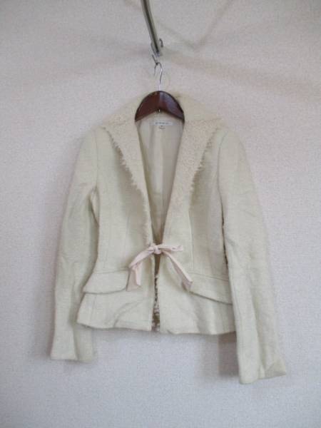| 商品紹介 | 襟のレースがオシャレなジャケットです。 本体部分は丸い毛足の少し起毛したツイードのような素材です。 前はリボンで留めるか、リボンを外してフックで留めることもできます。 色はクリームがかった白です。 袖口には9cm程スリットが入っていて、折り返しても着ることができます。 ※リボンはボタンで付いてい手取り外し可能です。 またフックは1カ所のみ付いています。 《素材》 羊毛53% モヘヤ34% ナイロン13%(スリット糸使用) レース部分:ナイロン100% 裏地:キュプラ ※割合の記載なし リボン:ポリエステル100% |