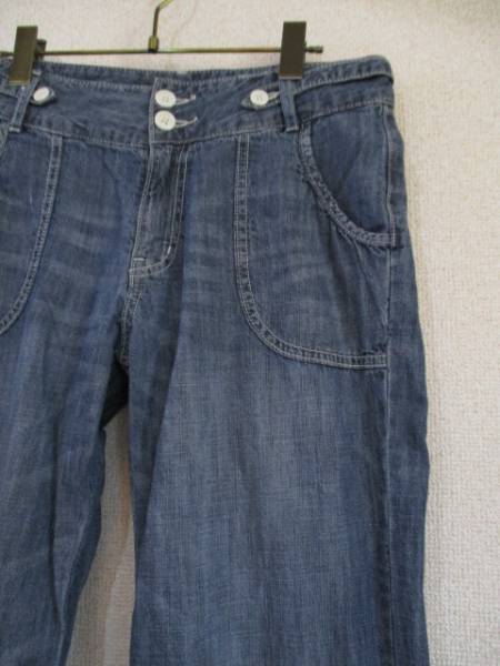 商品紹介 | デニム素材のワイドパンツです。 ウエストのベルト飾りと白いボタンがポイントになっています。 ポケットの端は軽くギャザーが入っています。 腰回り、太もも、ひざの裏等に色落ち加工が施されています。 《素材》 綿100% |