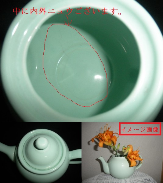 | 昭和レトロのティポットです。 まん丸い形の良いティポットです。 残念ですが、中に内側と外側にニュウがございます。 また、つまみに部に虫食い1点とティポットの縁に当たり傷が1点ございますが、 中に湯呑を入れて花器としてご利用になれます。 このままインテリアとしてもしくは、お店のディスプレィにどうぞ! ※茶色の湯呑は、おまけでお付けいたします。(お花はついておりません。撮影用です) 以上ご理解して頂けるお方のご入札をお待ちしております。 サイズ 口径9cm 高さ13.5cm ※細かい点を気になさるお方もしくは新品をお求めのお方は、ご入札をお控えください。 ご理解納得されてのご入札をお願いいたします。 ♪お客様のPC環境で、実物の商品の色と多少の誤差が生じる場合がございます。それらの点を十分ご理解いただいた上でご入札頂きますようお願い申し上げます。 ♪お客様の思い描くイメージが違うと言った返品はご勘弁ください。 ♪システム手数料・消費税、梱包代金等、一切頂戴致しておりませんので、ご安心して御落札下さい。 ♪発送は基本的に、ゆうパックでの発送になります。 ♪ゆうパック 80サイズ(持込割引120円引)となります ♪梱包材は原則的段ボールなど再生のものを利用しております。 プチプチで包んでしっかり丁寧梱包を心がけていますのでご安心ください。 | |||