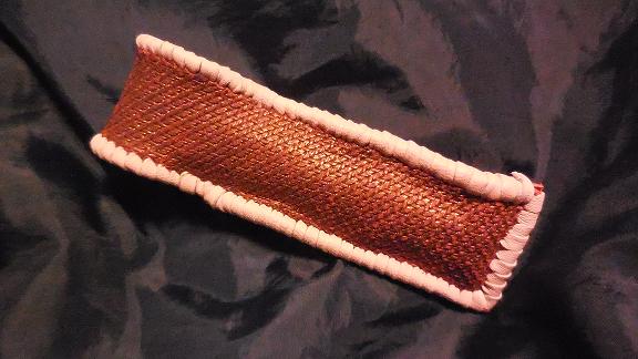 表面の蓋から後ろ側にかけては、カッパーレッドの編み込みデザインレザーを使用しています。ます。