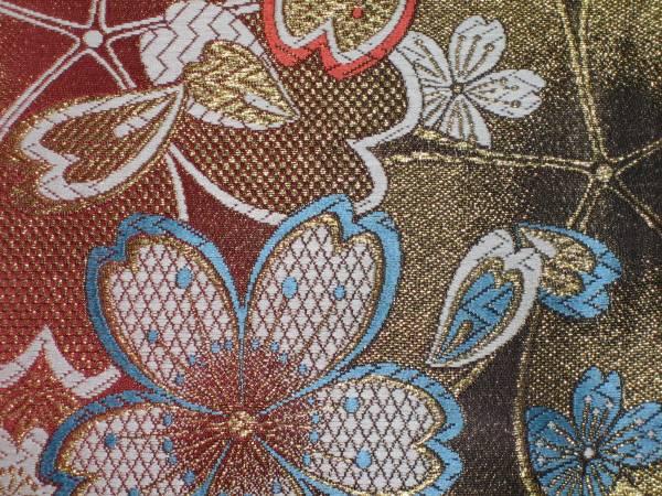 なお、帯柄左上に無地で出ているところは裏無地、たれ、中無地(手先と前太鼓のあいだの無地部分)、太鼓部、前腹部となります。六通柄です。金銀糸が多用されている場合ストロボの照りで、しろぽく写っている部分があります