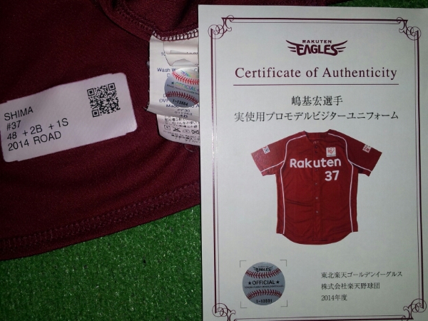 東北楽天イーグルス・嶋基宏選手が'14シーズンに実使用した直筆サイン入りユニフォームです。球団発行の証明付です。