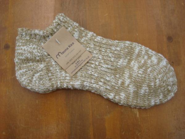 新品Mauna Kea(マウナケア)スラブネップスニーカーMENS Beigeです、正式名は→スラブネップスニーカー MENS 118183 、正式カラー名は→Beige、素材はCotton 70%Hemp 30%です!サイズは25-27cmのワンサイズです!まだお知りでならない方にソックスブランド mauna kea (マウナケア)の説明です!もとは足袋や素足の文化だった日本に、靴下が普及しはじめたのは明治時代。文明開化とともに洋装が一般化し、革靴に合わせて履かれるようになった。そうした需要を受け、明治後期より靴下の生産が盛んになったのが奈良県広陵町である。江戸時代より綿花と木綿の産地だった広陵町は、その背景を活かして海外より靴下用の手回し編み機を導入。大正時代には自動編み立て機も導入され、米作農家が農閑期に行う副業として広まった。戦後の最盛期には、地元の組合に200軒以上の靴下工場が加盟していたという。現在でも国内で生産される約6億本の靴下のなかで、日本有数の靴下の産地である奈良県広陵町はシェア約4割と日本一を誇っているのです。mauna keaで使用しているのは多彩な色糸とネップが不均一に混ざった杢糸。機能性と天然素材にこだわり、吸湿性と速乾性を兼備させるためにコットンにヘンプを混紡した素材です。厚手の生地ですので丈夫で抗菌消臭効果もあり汗を吸収する素材と水分を発散する素材を混合しているので、蒸れにくく爽快な履き心地がオールシーズン持続します!またゴム部分の締め付けを一箇所に集中させず、ゴムの範囲を広くとることでゴムの締め付ける力を分散しています。この結果ゴム部分が蒸れにくく、痒みなどのお肌へのストレスの軽減、 また、ズレの防止効果を実現しました。靴下は筒状に編まれるのですが、編み機の特性上、径の太さは一定になります。そのため、パターンで履き心地を出すには限界があり、編み目と糸の太さが重要になってきます一般的な編み機で靴下を製造する場合、その針数が170本~180本なのに対し、日産80本ほどと規模は小さいながらも、25年以上も前から稼動し続けるこの編み機はその3分の1である60本です。針数60本の靴下は、一般的な180本の編み機よりも編み目に余裕があり、糸も通常より太いものを使うことができる。つまり余裕のある編み目がそれぞれの足のカタチに沿うため、とても履きやすい靴下になるというわけです。編み機が古いものなので日本国内にはほとんど残っていませんが、ザックリとした編み目はこれでしか再現できません。麻と綿の微妙なバランスそして土踏まずを刺激するサポーター履き心地は抜群に良くこの混率が汗を吸い外へ出しあの嫌なベタベタ感が無く何時でもサラサラで快適また丈夫で長持ちも致します。現在は吸湿速乾性をうたった化学繊維の靴下などもありますが、それは天然素材が本来もっている機能を再現したにすぎず、ウールやヘンプでもその特性をうまくコントロールすれば十分快適な靴下はつくれるんです。靴を脱いだ時、こんな靴下はいてたら、素敵じゃないですか?たかが靴下!されど靴下です!色の方は、各パソコン、デジカメによって多少異なりますので、ご了承下さい、ノークレーム・ノーリターンでお願いいたします。ご質問に関しましては、火曜日を除く、午後12~午後9(21)時までに、お早めにお願い致します。この商品以外も、その他、色々出品しておりますので、是非ご覧下さい。