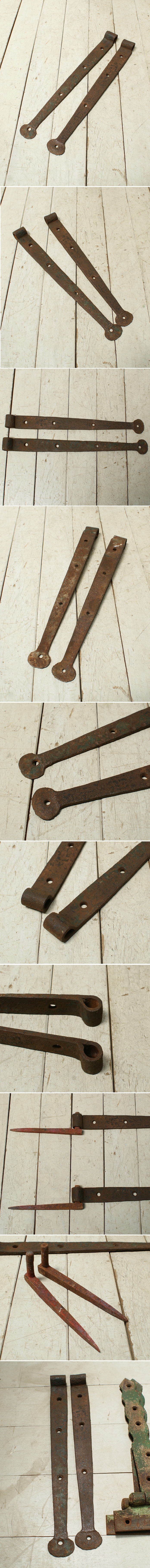 イギリスの蚤の市で見つけてきた古い、鉄製のヒンジです。シャビーな風合いがとても素敵です。取り付けるだけでインパクトのあるドアになります。ショップディスプレイとしてもオススメです。サイズが少し違います。全長51.5cmと50cm 高さ4.8cmと4.5cm  L字 の金物は本体に対して、若干径が小さく余裕があります。(多分出所が違う)   サイズ全長51.5cm  ヒンジ高さ4.8cm   奥行きcm 厚みcm                  年代年代推定1900~1920年代