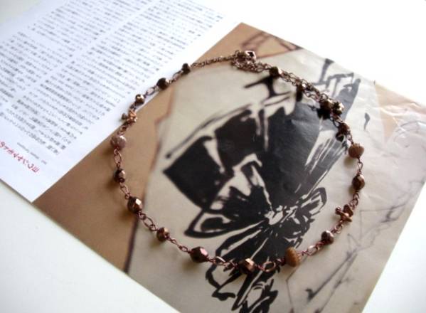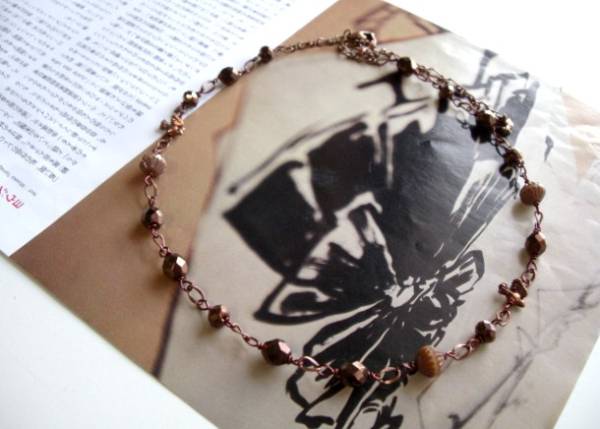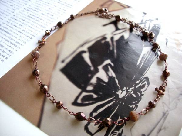 アンニュイ気分で・・シリーズです♪秋の小鳥さん・・シックなブロンズ色のチェコビーズと小鳥さんのネックレスです♪ブロンズ色のチェコビーズ と小さな小鳥さんがネオ・ロマンチックしています♪6ミリから9ミリ位までのチェコビーズは同じブロンズ色の小さな小鳥さ んのメタルチャームを合わせました♪長さは56センチ位で調節自由です♪チョーカー風にされたりブレスにされても素敵です♪お揃いのネックレスやブレス レットやピアスも出品しています♪シンプルで飽きのこないいつまでも着けられるデザインを考えて作りました♪ハンドメイドをご理解頂いて ノークレーム、ノーリターンでお願いします