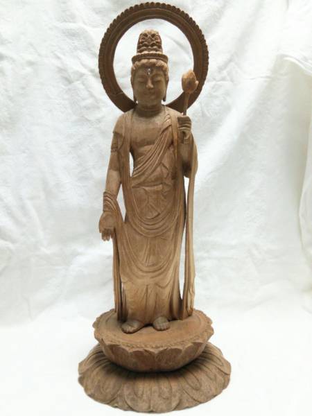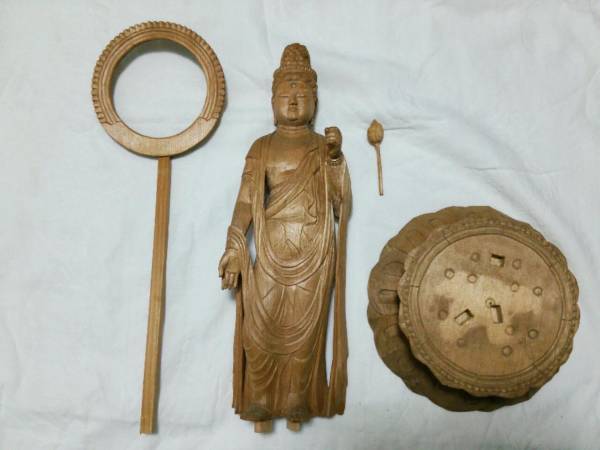 経年による多少の汚れがあります。本体と後背は土台に差し込んで立たせるようになっています。左手に持つ蓮の花は本体に差し込みます。