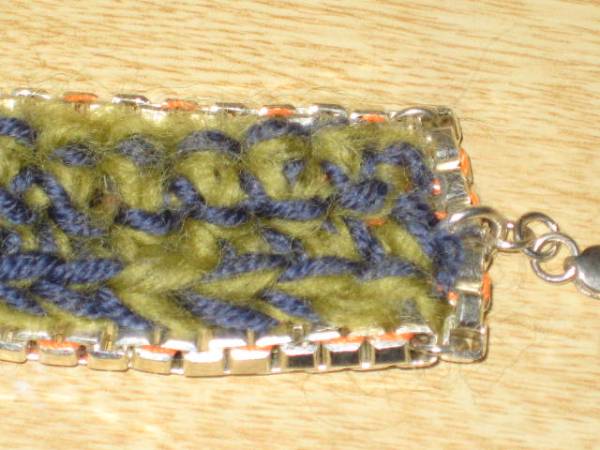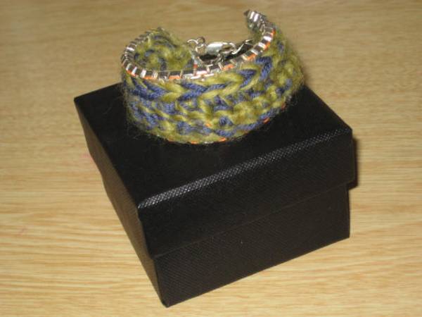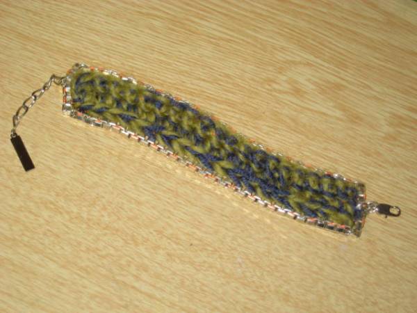 色目は緑と青が混ざっており、毛糸独特の温かみがありますが、ニットを縁取っているシルバーチェーンが甘さを抑えております。