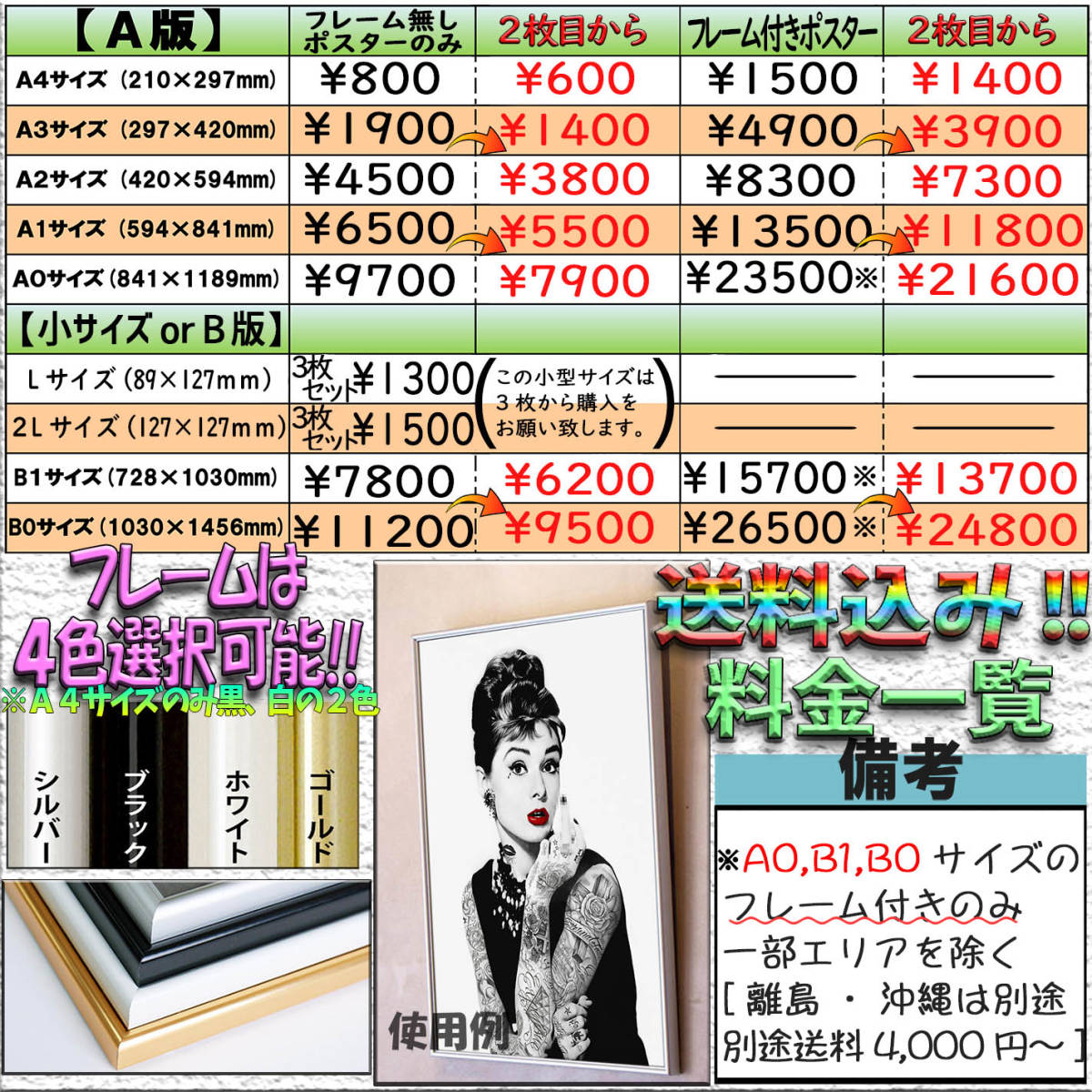 ●まとめ購入や大判サイズ等につきまして記載画像にあるサイズ別金額一覧を参照頂いた後、ご希望のポスター【商品番号】と有無と色をコメントより遠慮なくご連絡ください^^