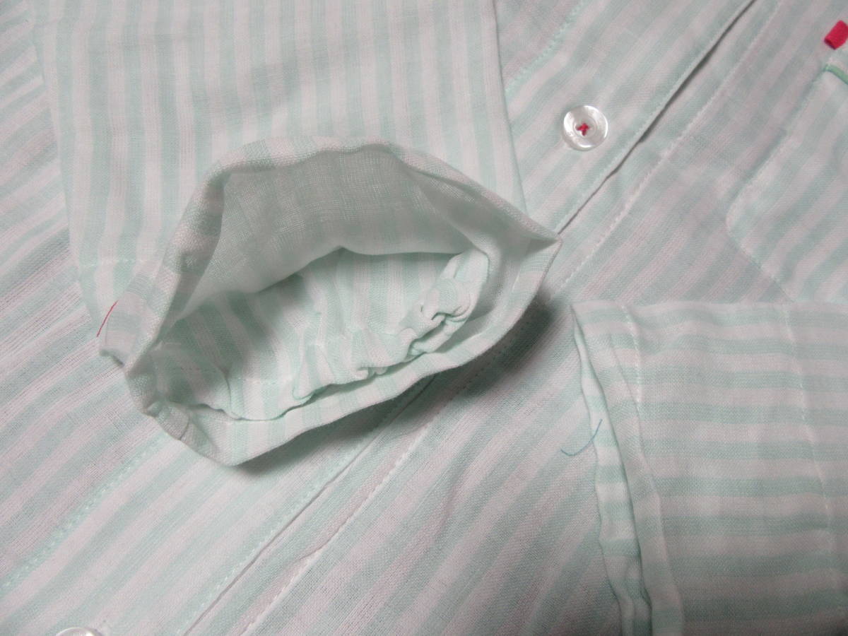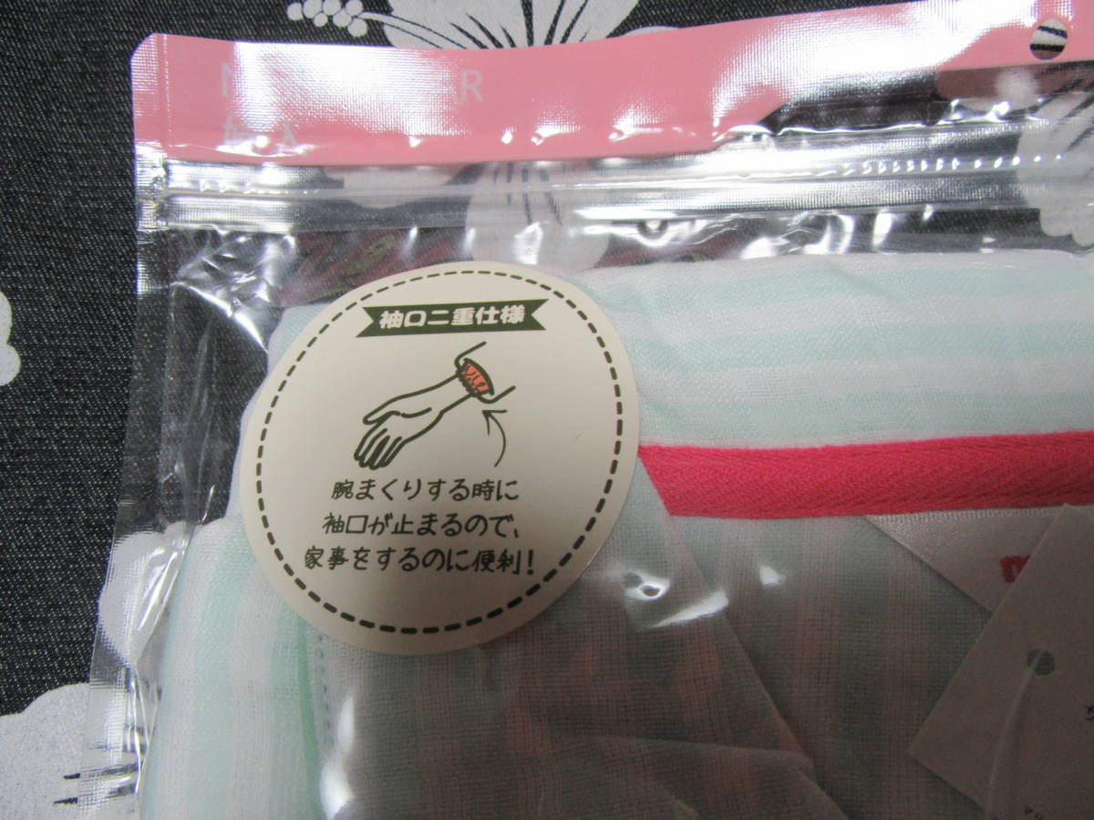 上着ボタンにロゴ入り、胸ポケットにロゴ刺繍あり、袖口二重仕様で、腕まくりする時に袖口が止まるので、家事をするのに便利です。