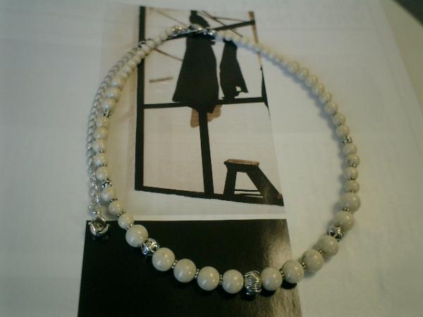 シックなリバーストーンとカレンシルバーでちょっぴり豪華(??)なネックレスを作りました♪4ミリと6ミリと8ミリのリバーストーンは大理石のような雰囲気のあるこれからの季節にぴったりの石です♪アクセントにアンティークな雰囲気のメタルビーズやお花模様やデザイン違いのカレンシルバーを挟んでいます♪柔らかなオフ・ホワイト系でまとめました♪お洋服を選ばないシンプルなデザインで長く着けて頂けると思います♪長さは37センチ+アジャスター14センチで最長51センチ位です。チョーカー風に着けられても可愛いです♪お揃いのブレスレットも出品予定です♪ハンドメイドをご理解頂いてノークレーム、ノーリターンでお願いします
