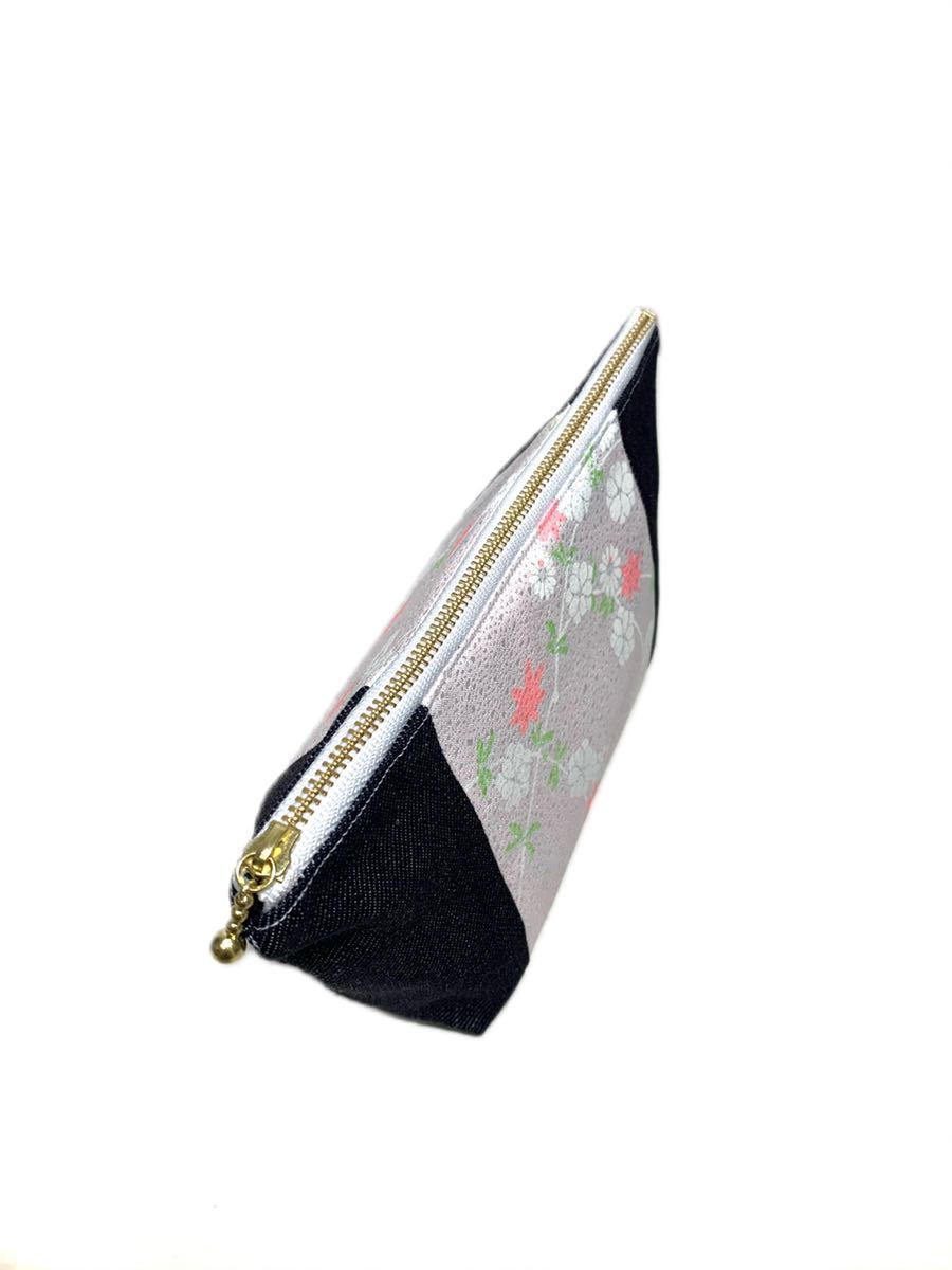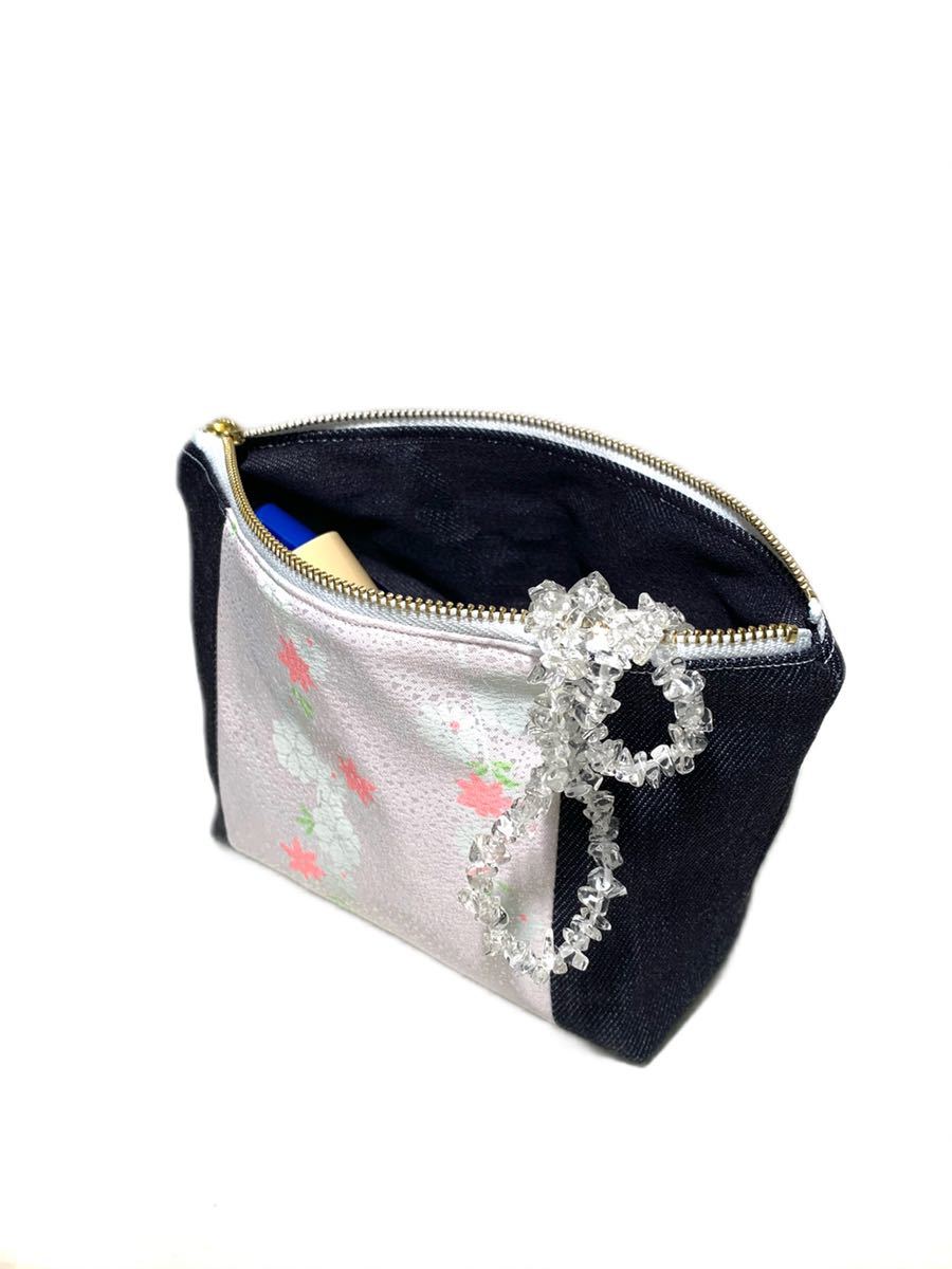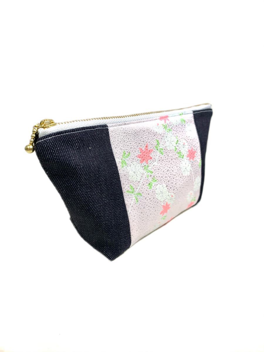 春カラー満載の可愛らしさと上品さを兼ね備えた花柄の高級着物生地を惜しみなく使い、岡山県産のインディゴカラーの児島デニムを組み合わせたカジュアルデザインポーチになります♪