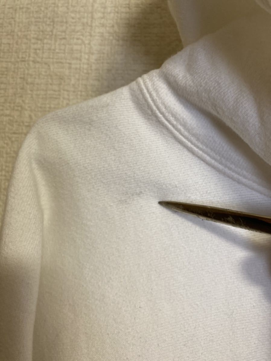 | あまり目立たないのですが、前身頃右肩部分に黒っぽい薄汚れがあります。 |