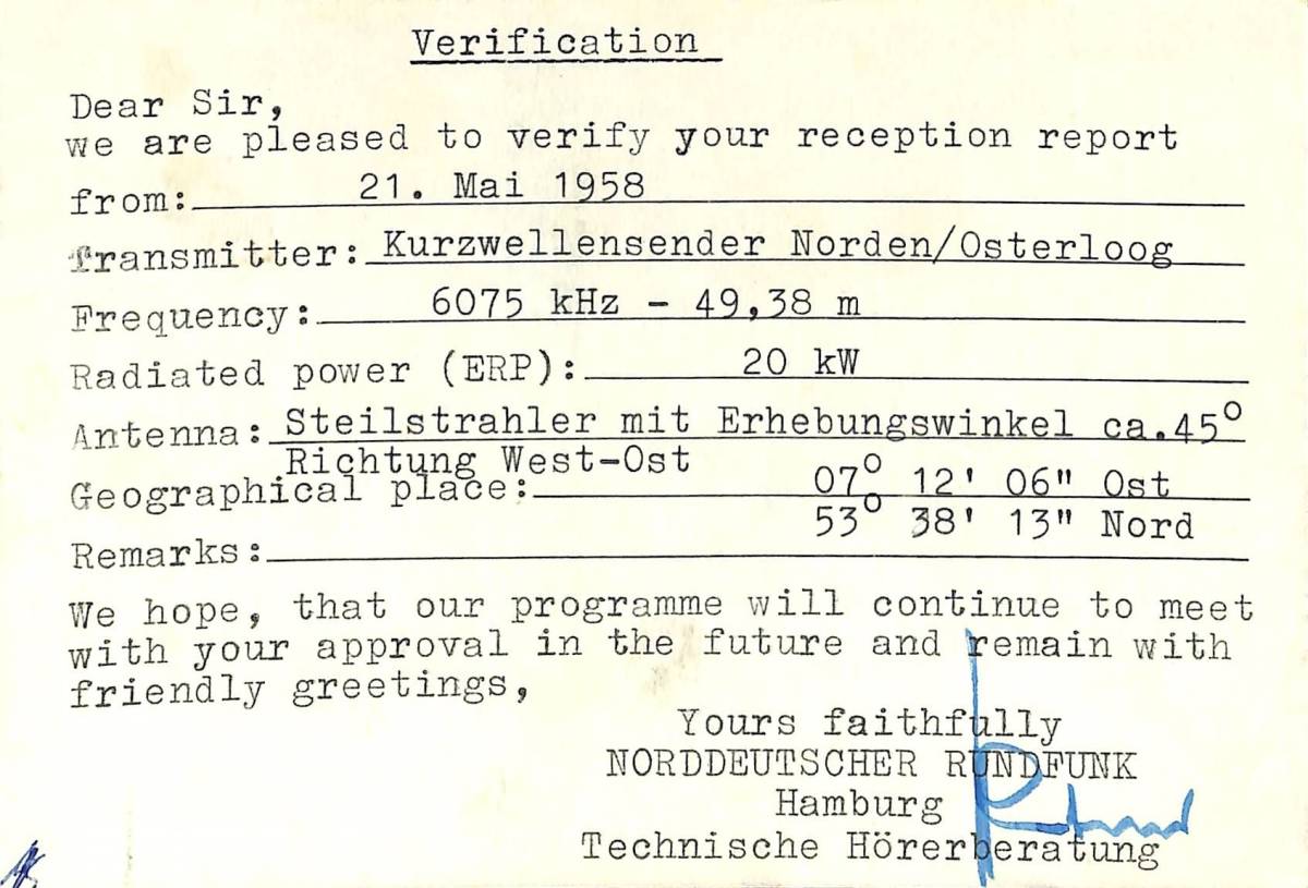 | 【商品名】・・・NORDDEUTSCHER RUNDFUNK(★NDR・北ドイツ放送)ベリカード。 【国名・地名】・・・・ドイツ連邦共和国★ハンブルク。 【受信データ】・・・1958年5月21日・SW6075KHZを受信。 【記載事項】・・・受信データのみ記載。 【状態】・・・シワ、汚れ、シミ、焼け、色あせ等があります。 ■カードの状態は★画像を参考に判断して下さい。 ■この機会にぜひこのベリカードを貴方のBCLコレクションに加えて下さい! | |