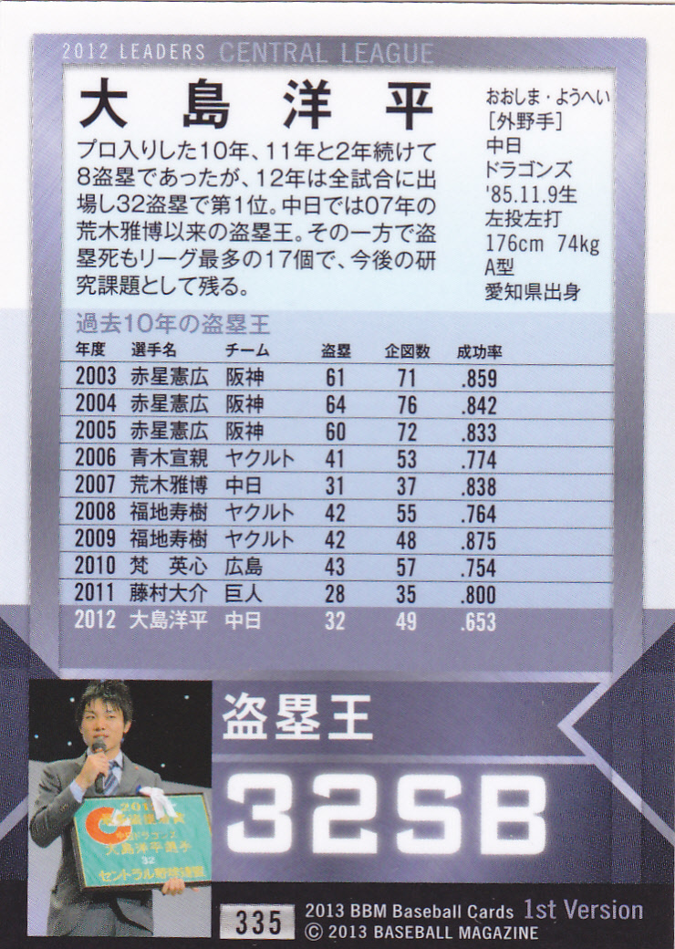 BBM2013ベースボールカード1st 335 大島洋平 盗塁王 愛知県 中日ドラゴンズ