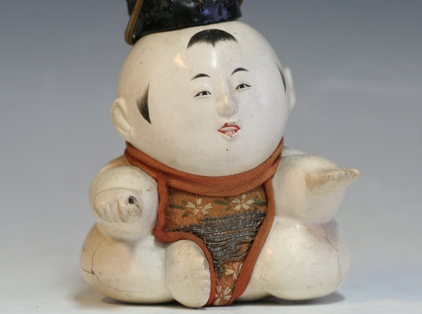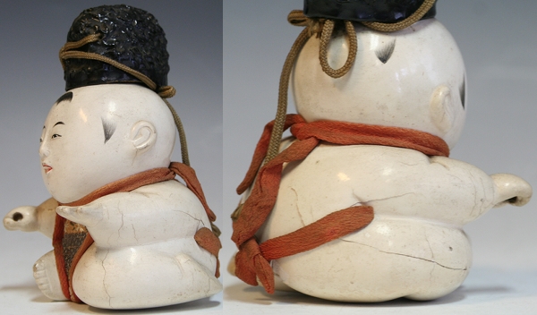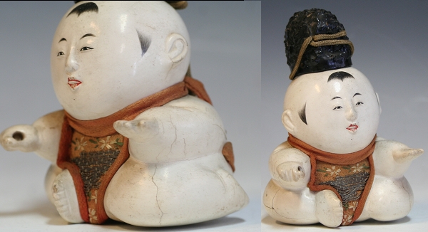 江戸時代後期頃の御所人形です。白い肌と大きな頭、まん丸の顔に小さな目鼻だち、ふくよかな体つきが特徴。頭には烏帽子をかぶり、手を前に突き出すように座っています。手には何か持っている様子ですが、残念ながら、持物は欠失しています。古いものですので、ヒビや汚れ、スレキズなどございます。状態の詳細は画像にてお確かめ下さい。更に詳細画像をご希望の方はお気軽にお申し付け下さいませ。お分かりの方、宜しくお願いいたします。